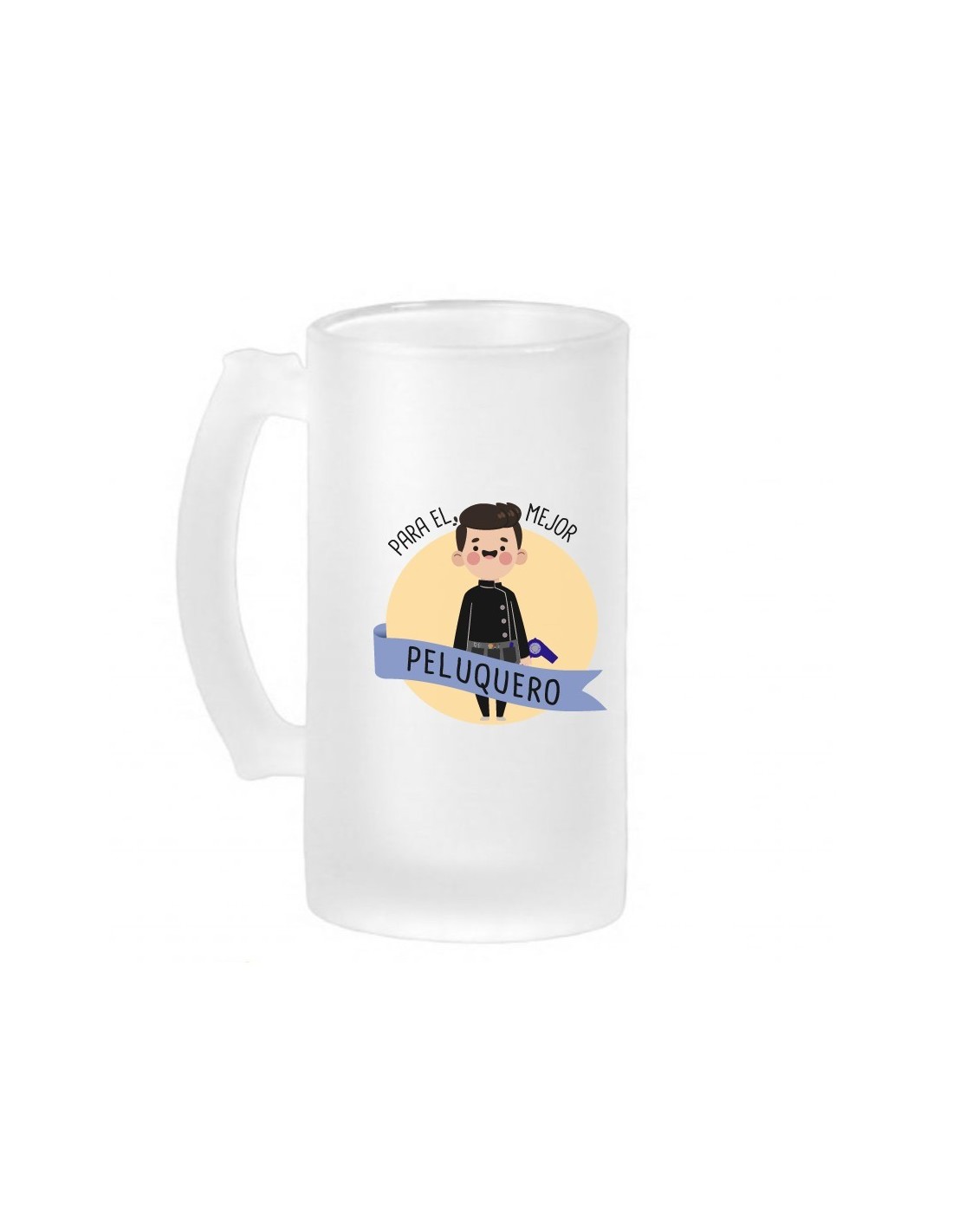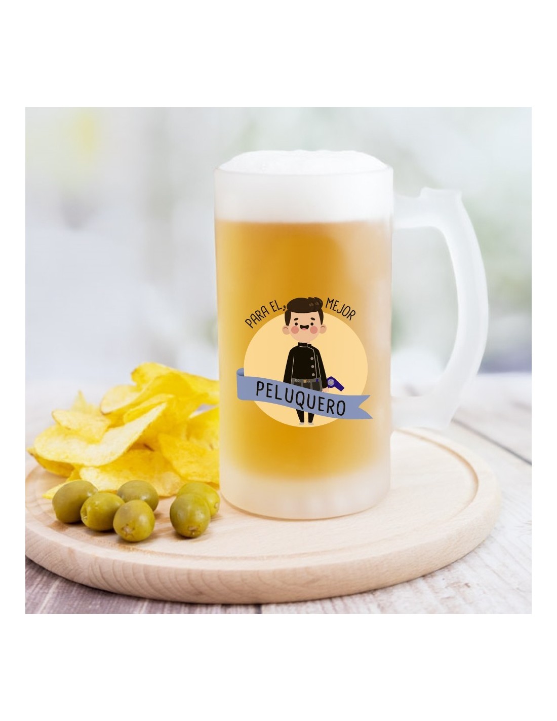 Original jarra de cerveza de vidrio esmerilado decorada con el mensaje "para el mejor peluquero".