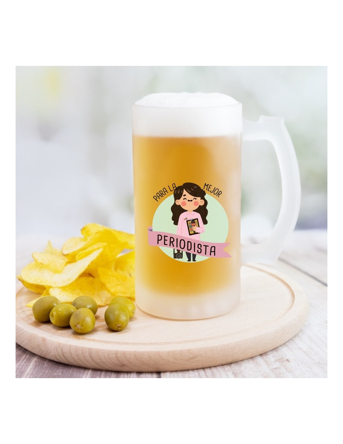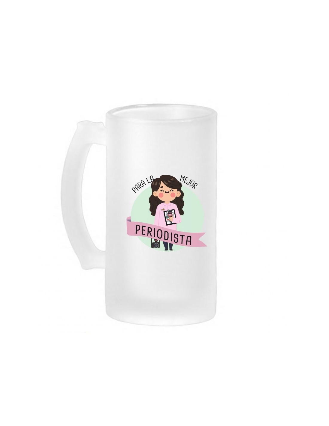 Original jarra de cerveza de vidrio esmerilado decorada con el mensaje "para la mejor periodista".