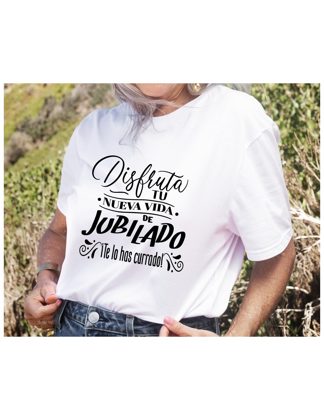 Original camiseta blanca decorada con el texto "Disfruta tu nueva vida de jubilado ¡te lo has currado!".