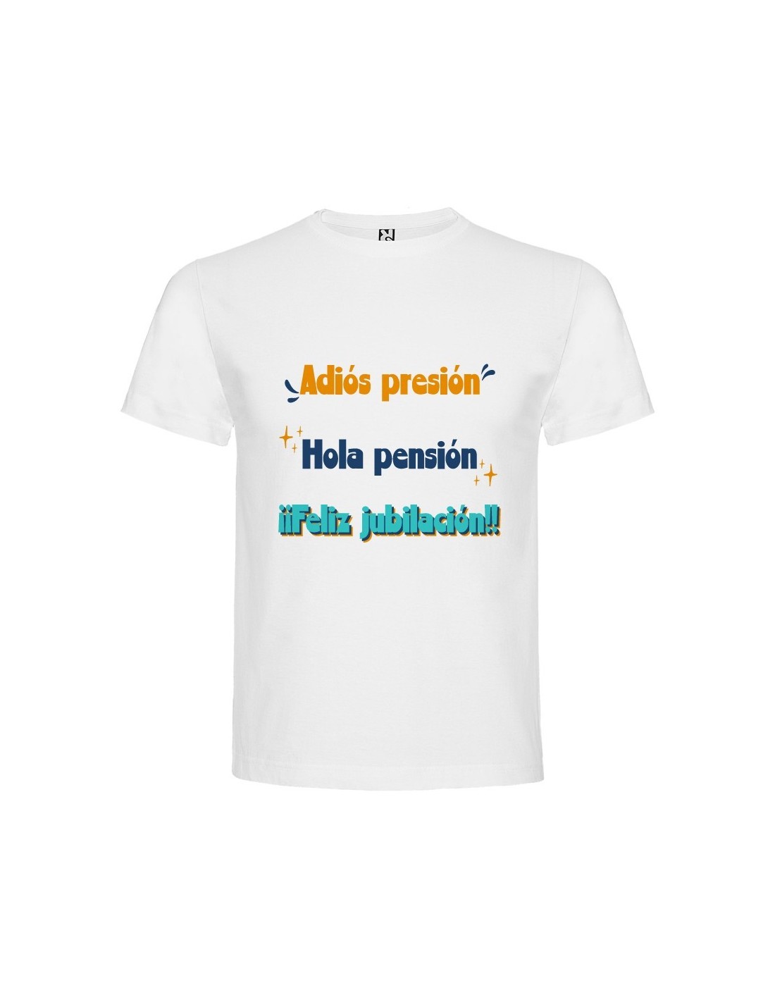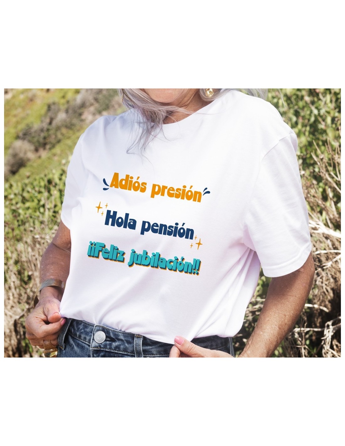 Original camiseta blanca decorada con el texto "Adiós presión, hola pensión ¡¡feliz jubilación!!".