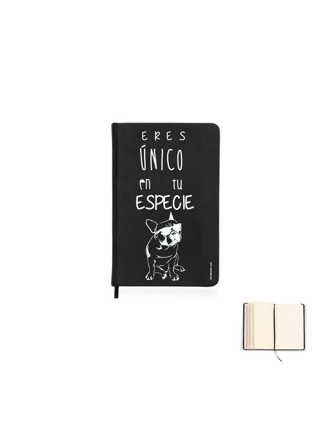 Divertida libreta negra con mensaje "eres único en tu especie" y un moderno perro. Perfecta para las anotaciones diarias.