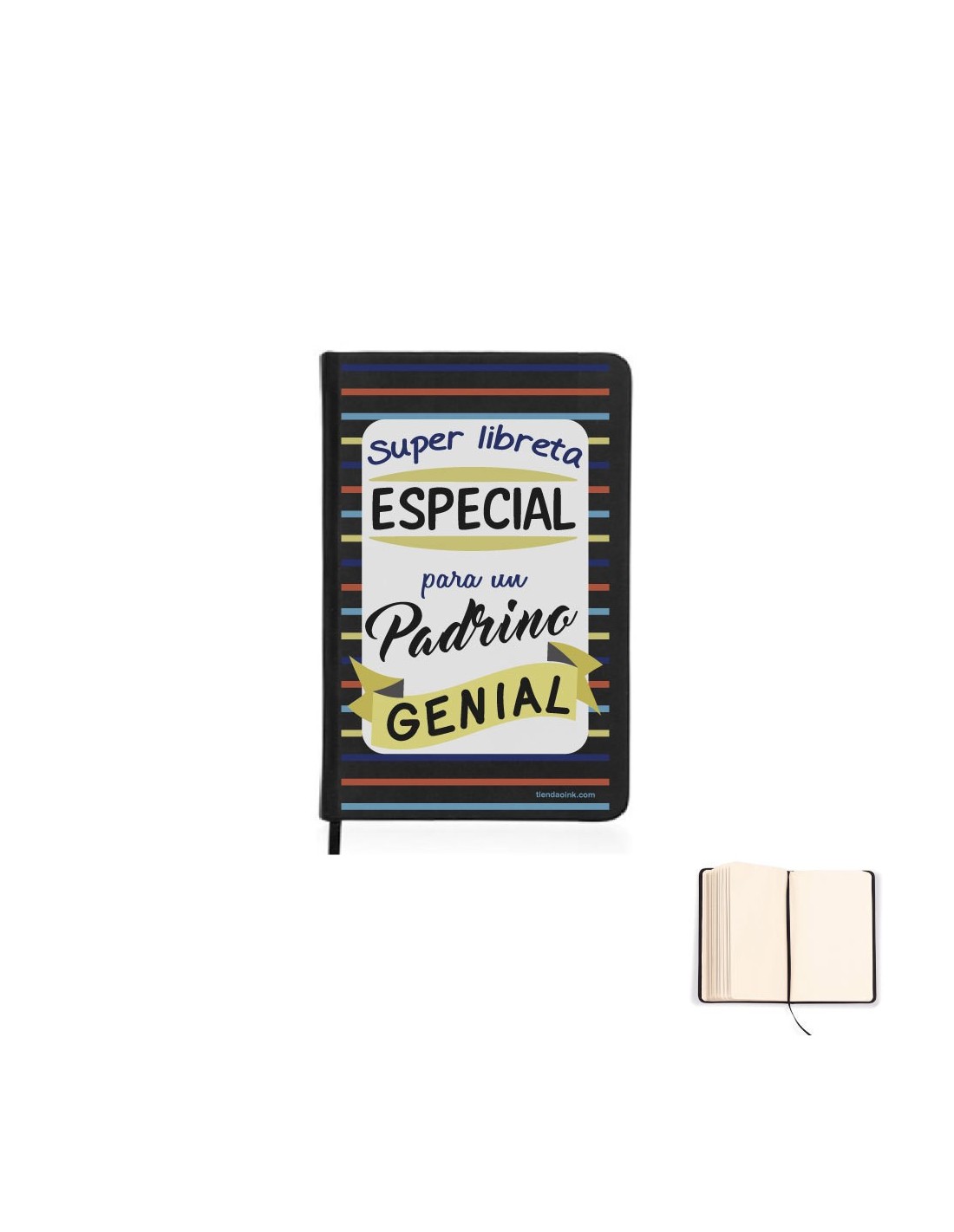 Divertida libreta negra decorada con el mensaje "Super libreta especial para un Padrino genial". Perfecta para las anotaciones del día a día y así no dejar escapar ninguna idea. Puedes usarla como agenda, diario, ... o lo que se te ocurra!