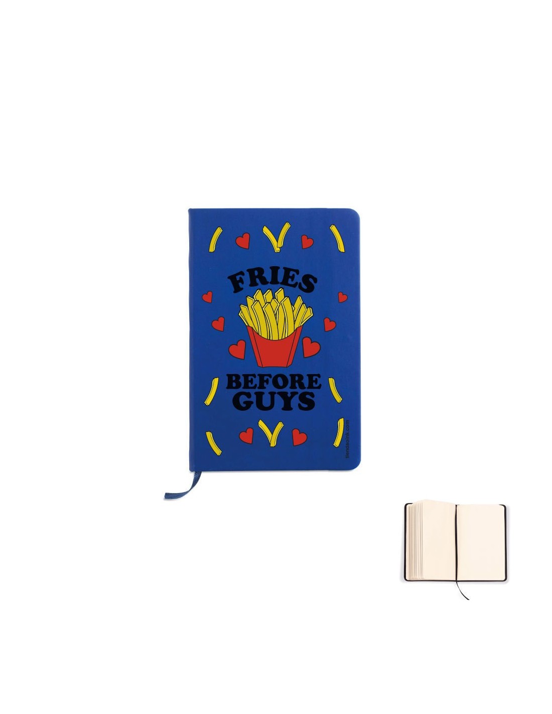 Original libreta azul decorada con el mensaje "Fries before guys". Perfecta para las anotaciones del día a día. ¡¡No dejes escapar ninguna idea!!