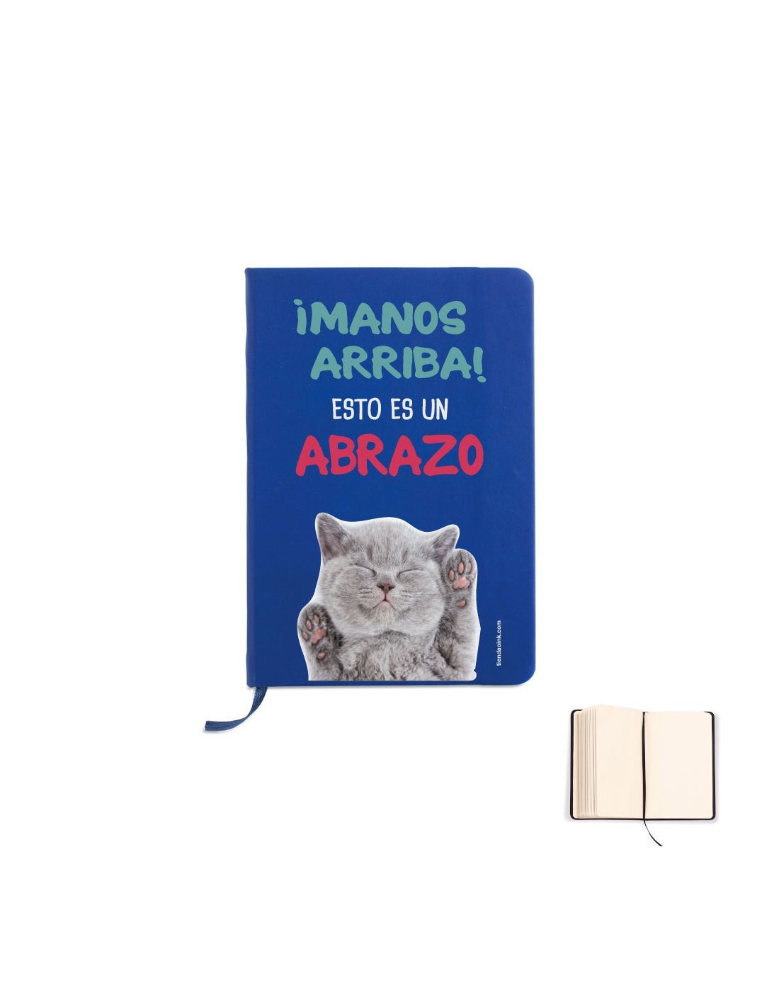 Original libreta azul A5 con mensaje: "manos arriba esto es un abrazoy la foto de un divertido gatito. Perfecta para las anotaciones del día a día. ¡¡No dejes escapar ninguna idea!!