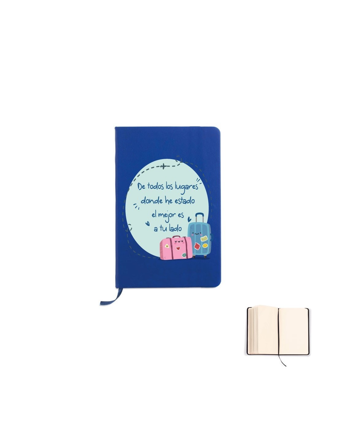 Original libreta azul decorada con el mensaje "La amistad no se mide en kilómetros, sino en ataques de risa". Perfecta para las anotaciones del día a día.