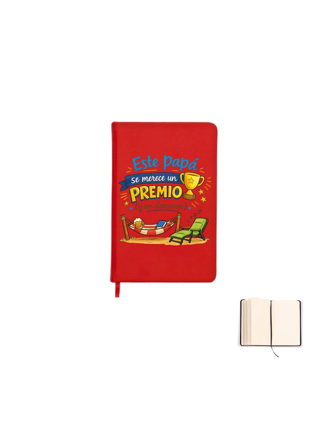 Original libreta color roja decorada con el mensaje "este papá se merece un premio (y un descanso)".