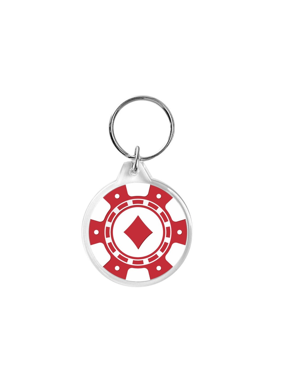 Original llavero acrílico decorado con ficha roja de póker con un corazón.