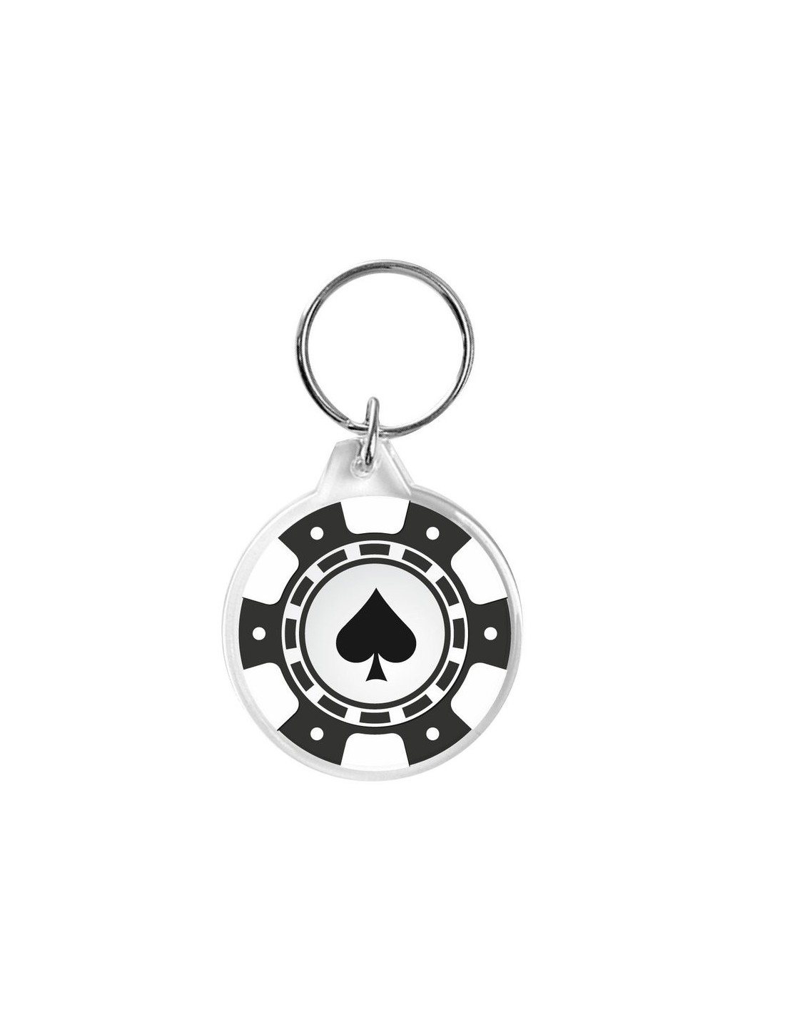 Original llavero acrílico decoradon con ficha negra de póker con un trébol.
