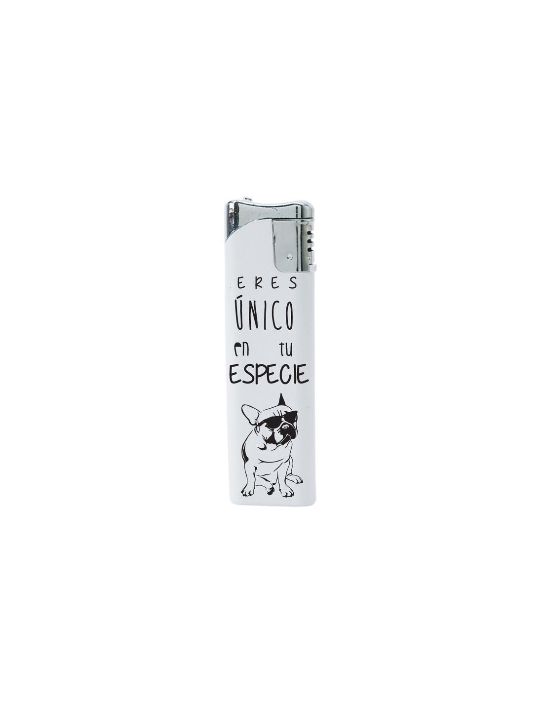 Original encendedor a gas recargable de color blanco decorado con el texto "Eres único en tu especie".