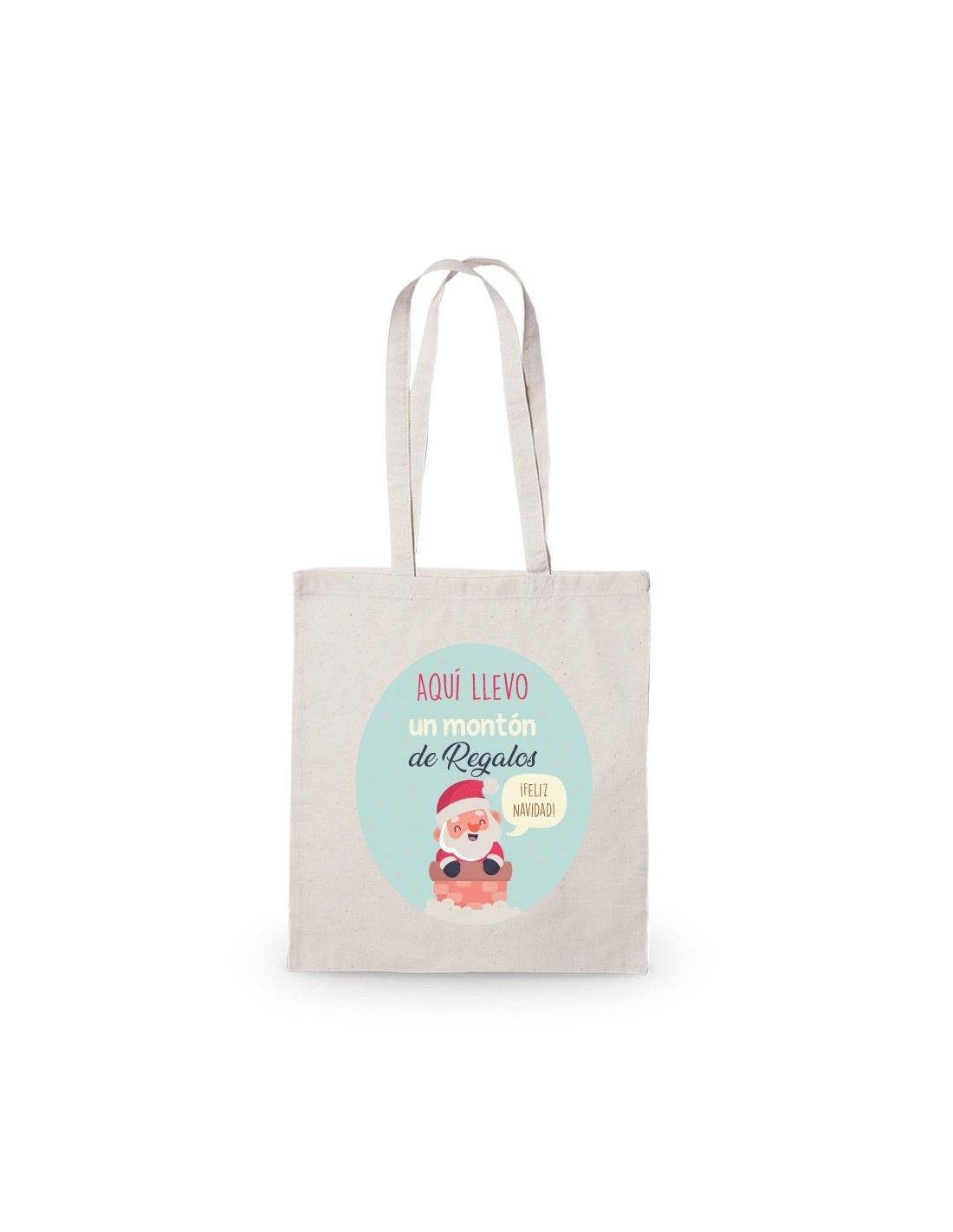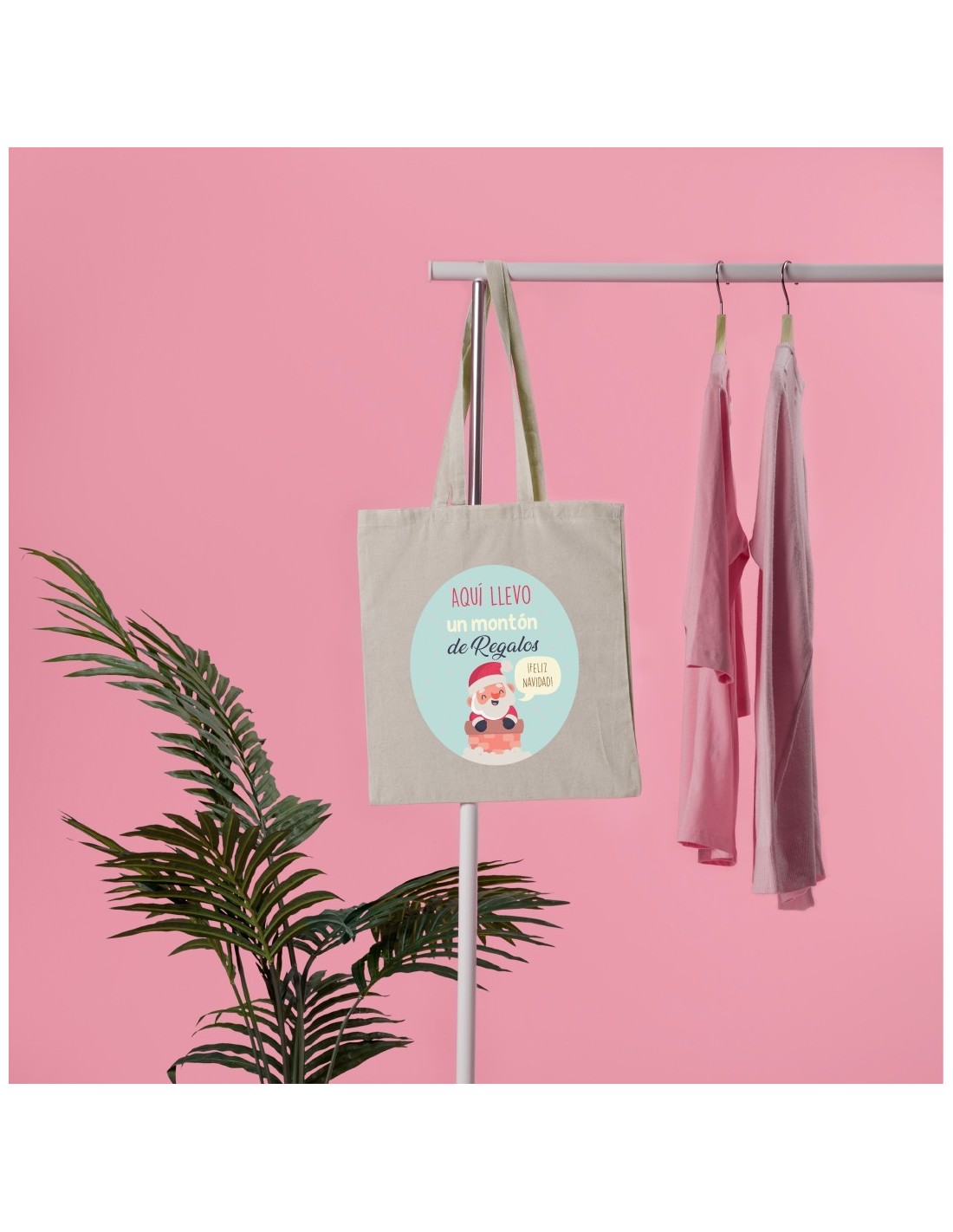 Amplia y ligera bolsa navideña de algodón decorada con el mensaje "aquí llevo un montón de regalos"