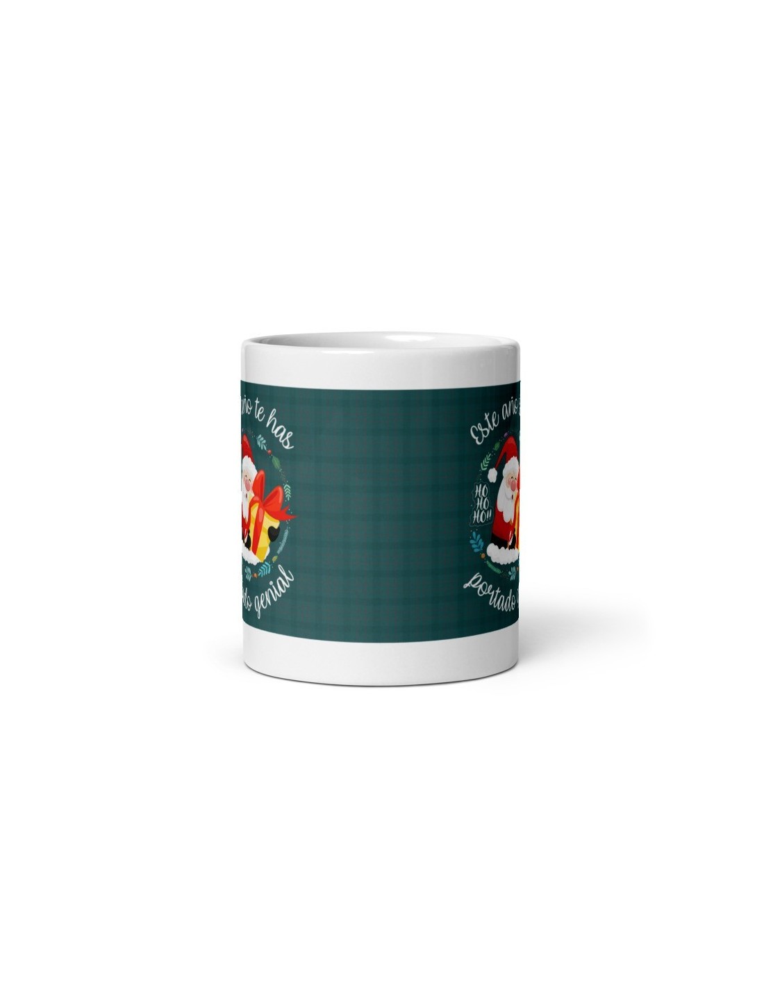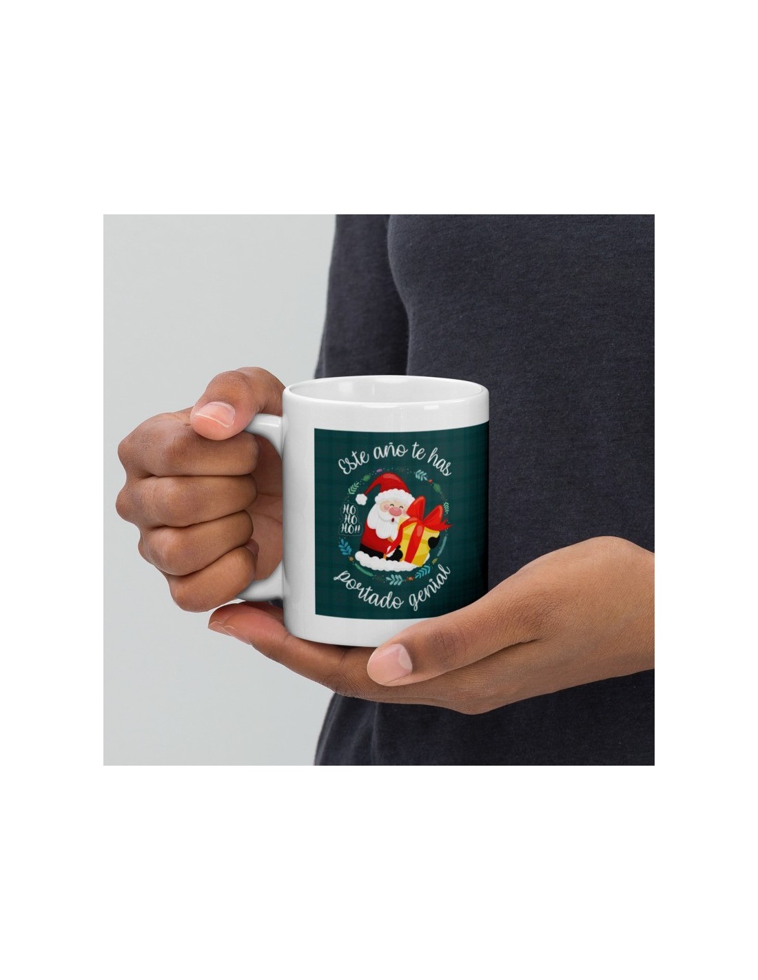 Divertida taza navideña de porcelana decorada con el texto "este año te has portado genial".