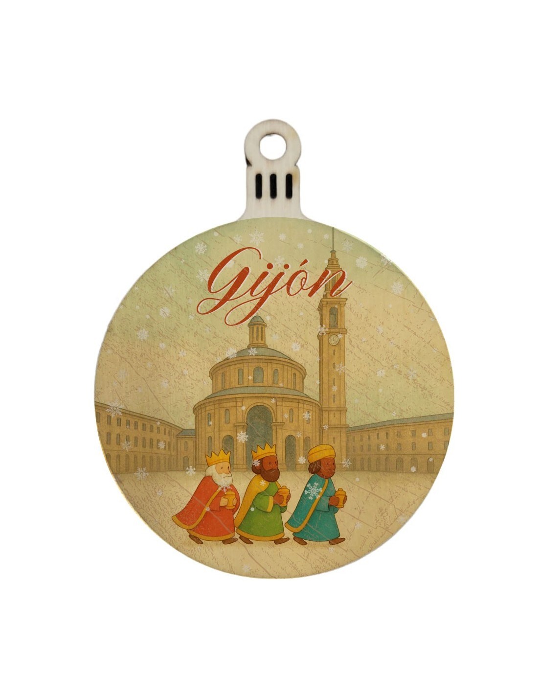 Original bola de madera de navidad de la ciudad de Gijón con los Reyes Magos paseando por la Ciudad Laboral.