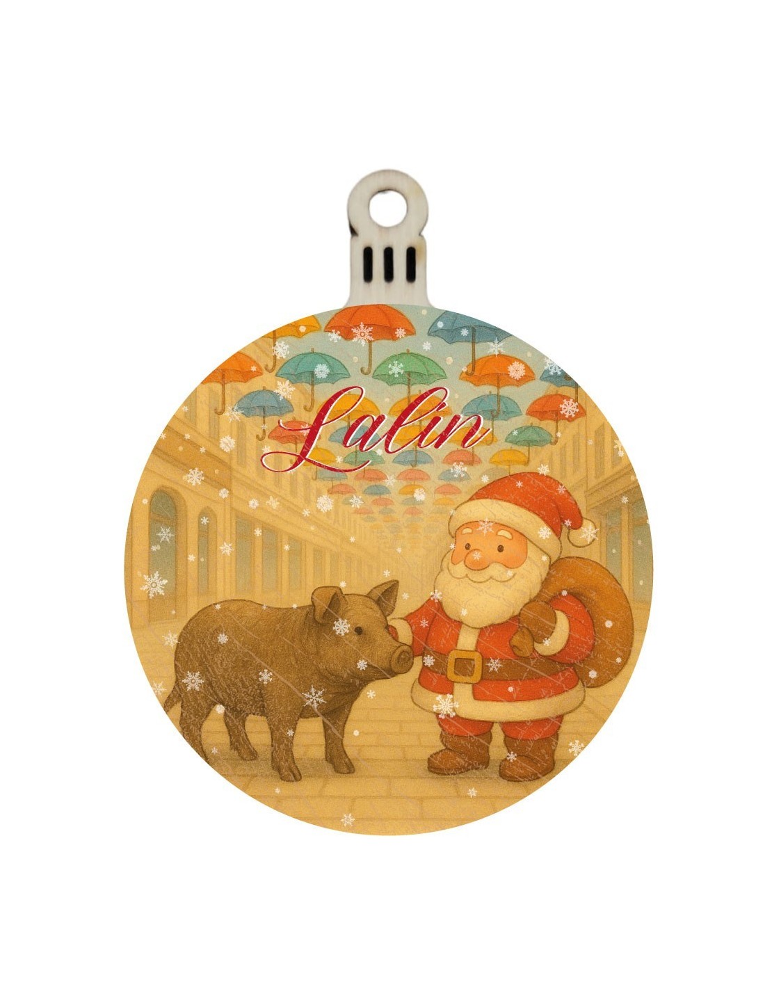 Original bola de madera de navidad de la localidad de Lalín con Papá Noel y el monumento al cerdo.