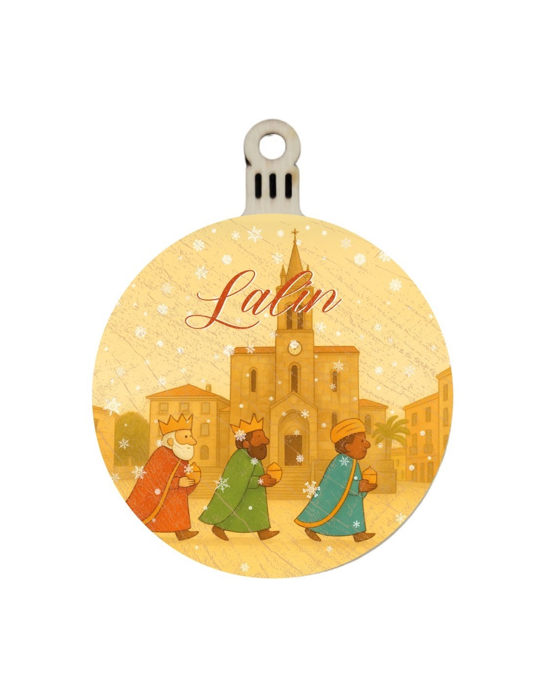 Original bola de madera de navidad de la localidad de Lalín con los Reyes Magos pasando por delante de la Iglesia de Santa Maria das Dores.