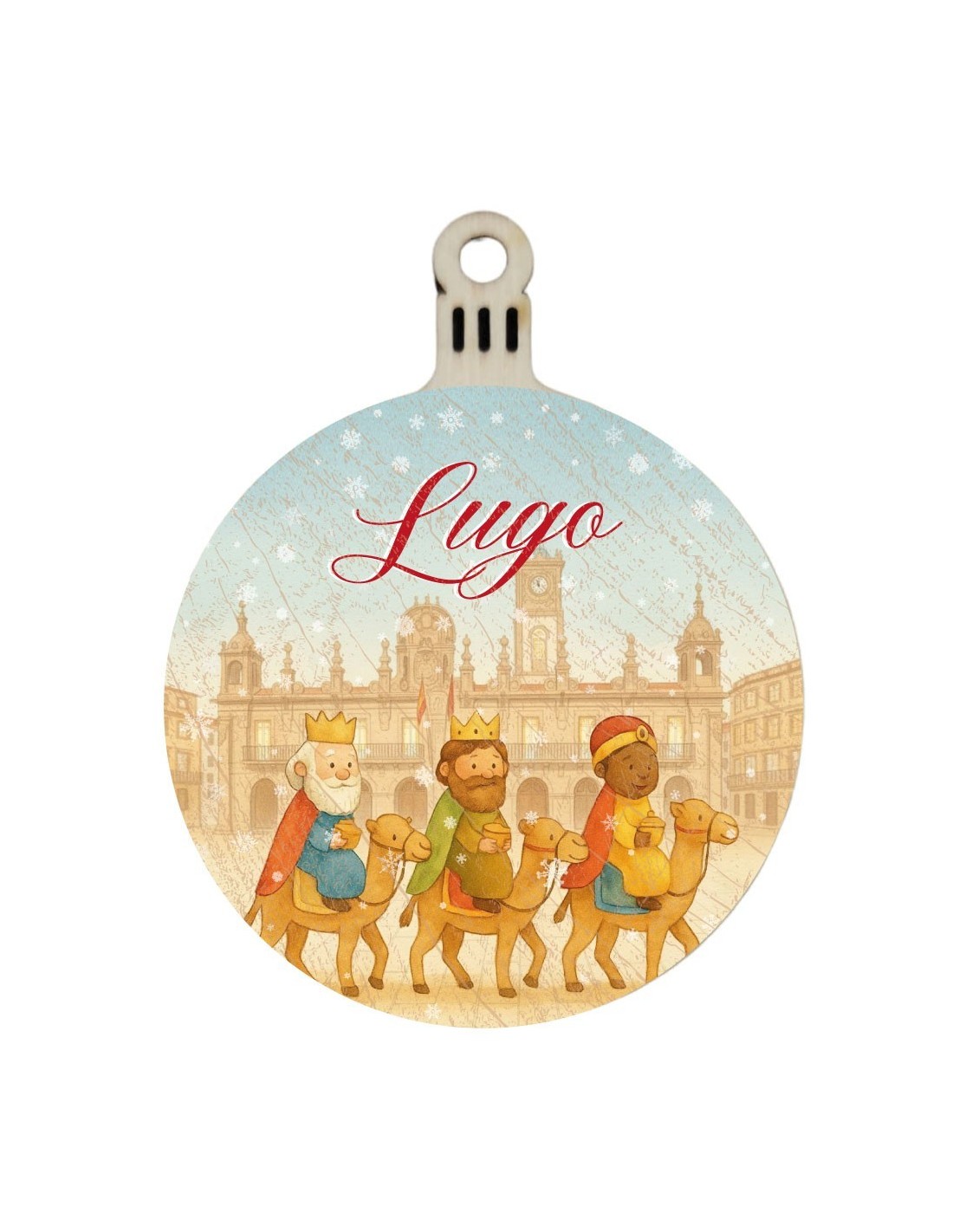 Original bola de madera de navidad de la ciudad de Lugo con los Reyes Magos paseando por delante del ayuntamiento.