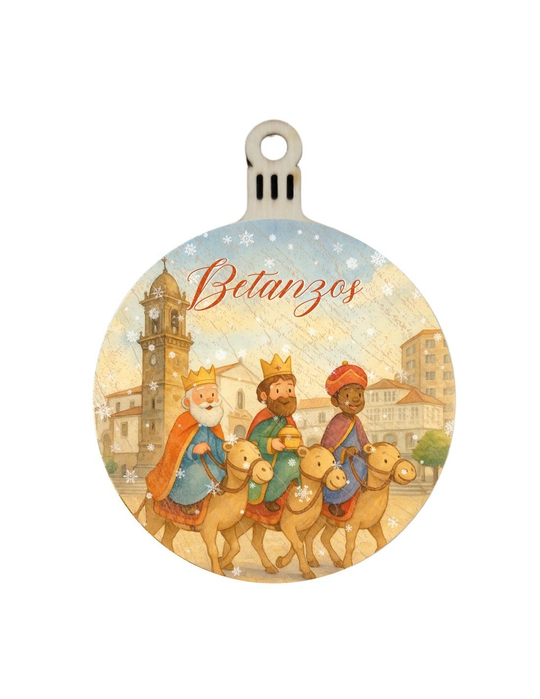 Original bola de madera de navidad del municipio de Betazos con los Reyes Magos paseando por delante de la plaza de los Hermanos García Naveira.