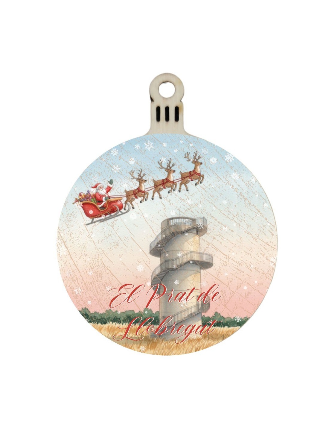 Original bola de madera de navidad del municipio El Prat de Llobregat con Papa Noel volando por encima del Mirador de l´Illa.