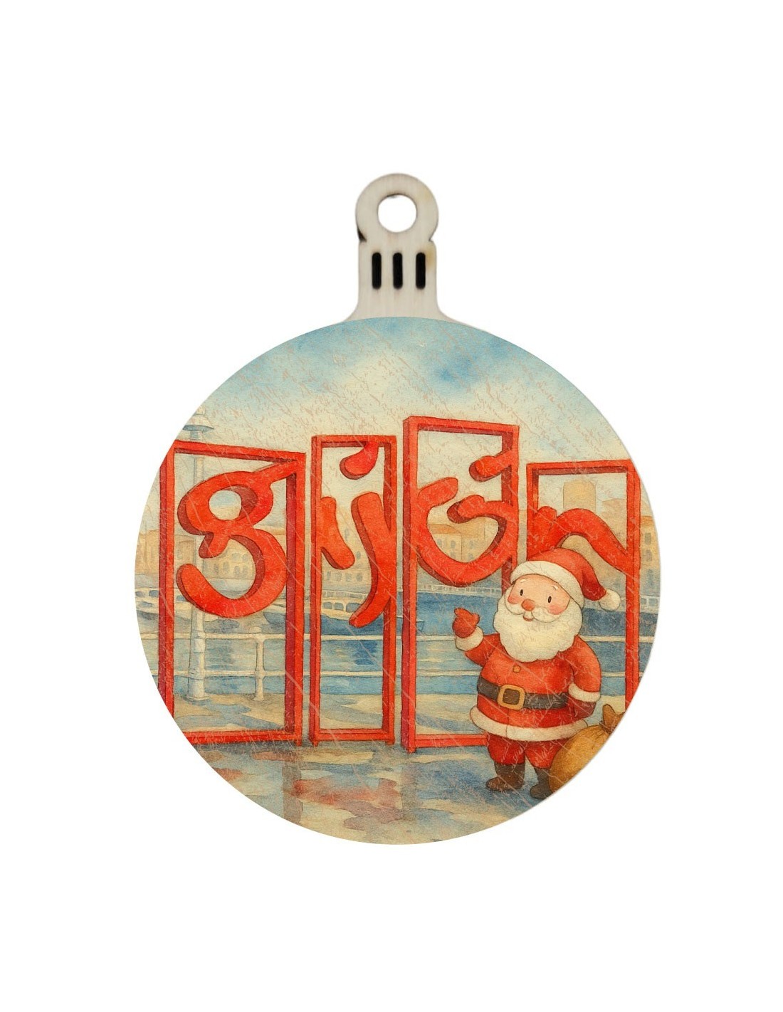 Original bola de madera de navidad de la ciudad de Gijón con Papá Noel al lado de Las Letronas.