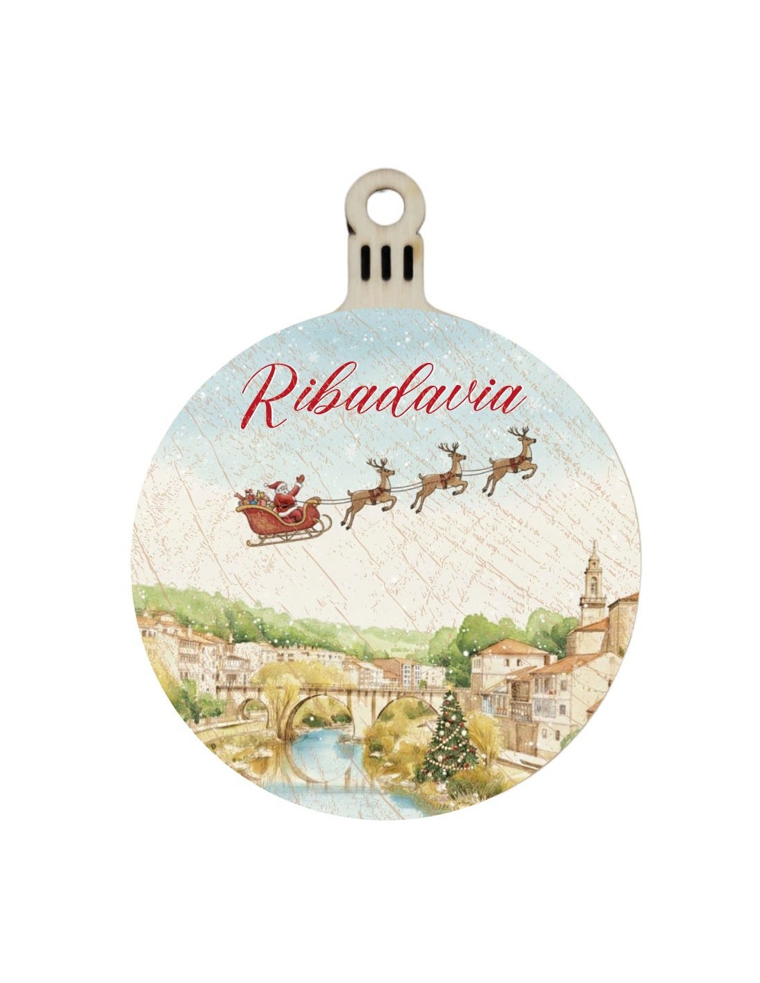 Original bola de madera de navidad del municipio de Ribadavia con Papa Noel volando por encima del río.