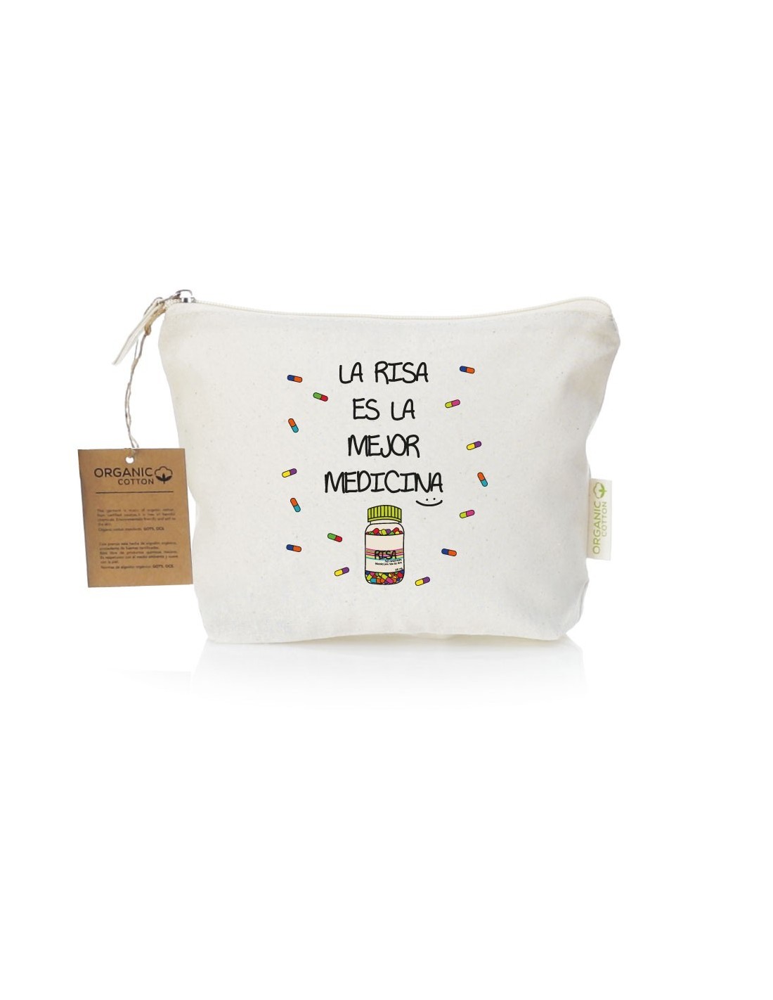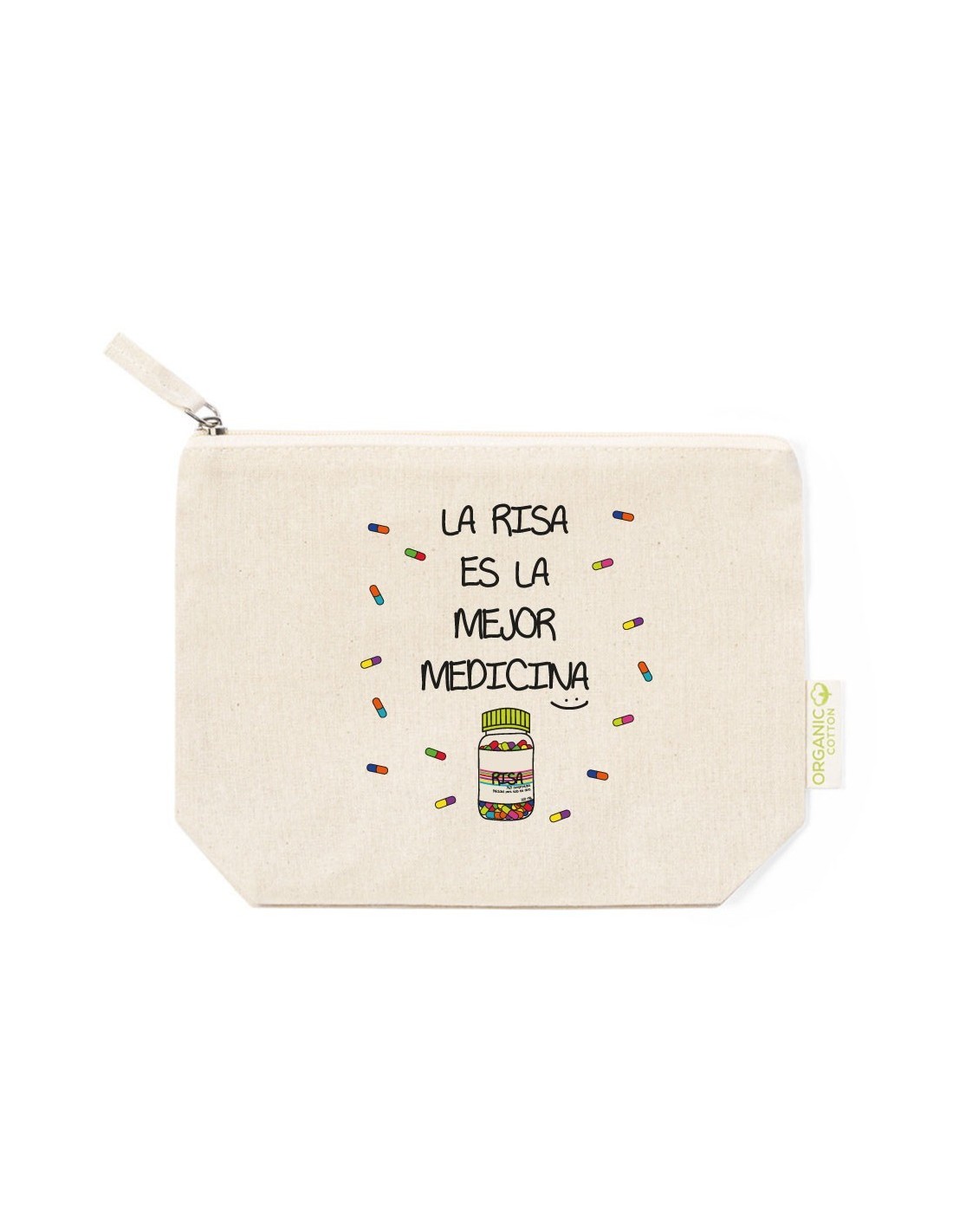 Práctico y ligero neceser de algodón con cierre de cremallera decorado con el mensaje "la risa es la mejor medicina".
