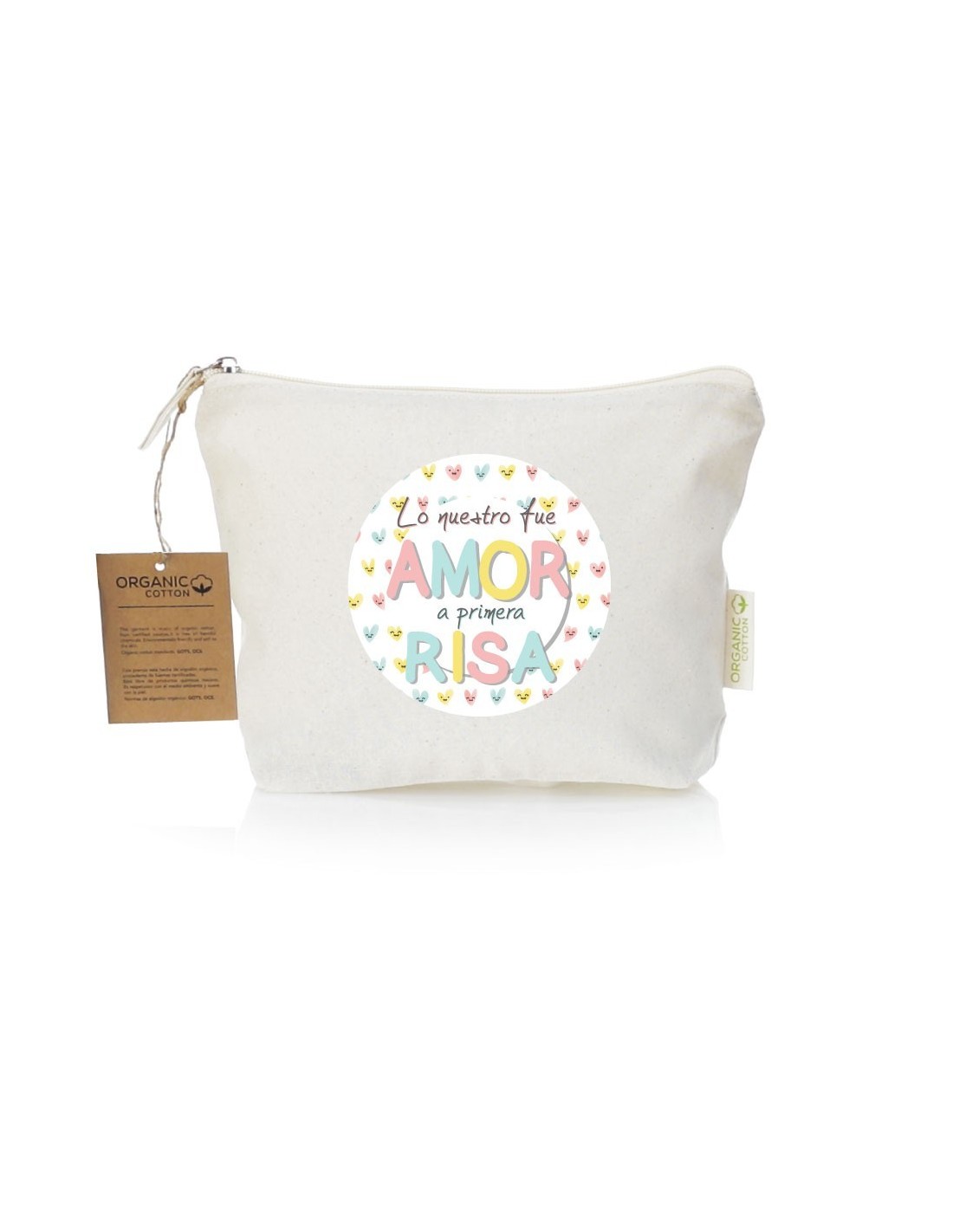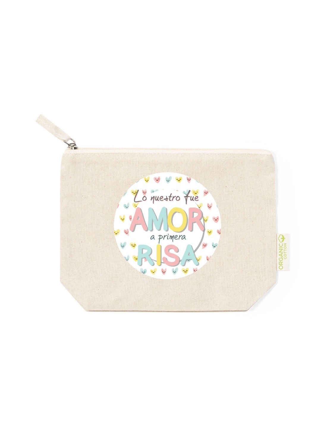 Práctico y ligero neceser de algodón con cierre de cremallera decorado con el mensaje "lo nuestro fue amor a primera risa".