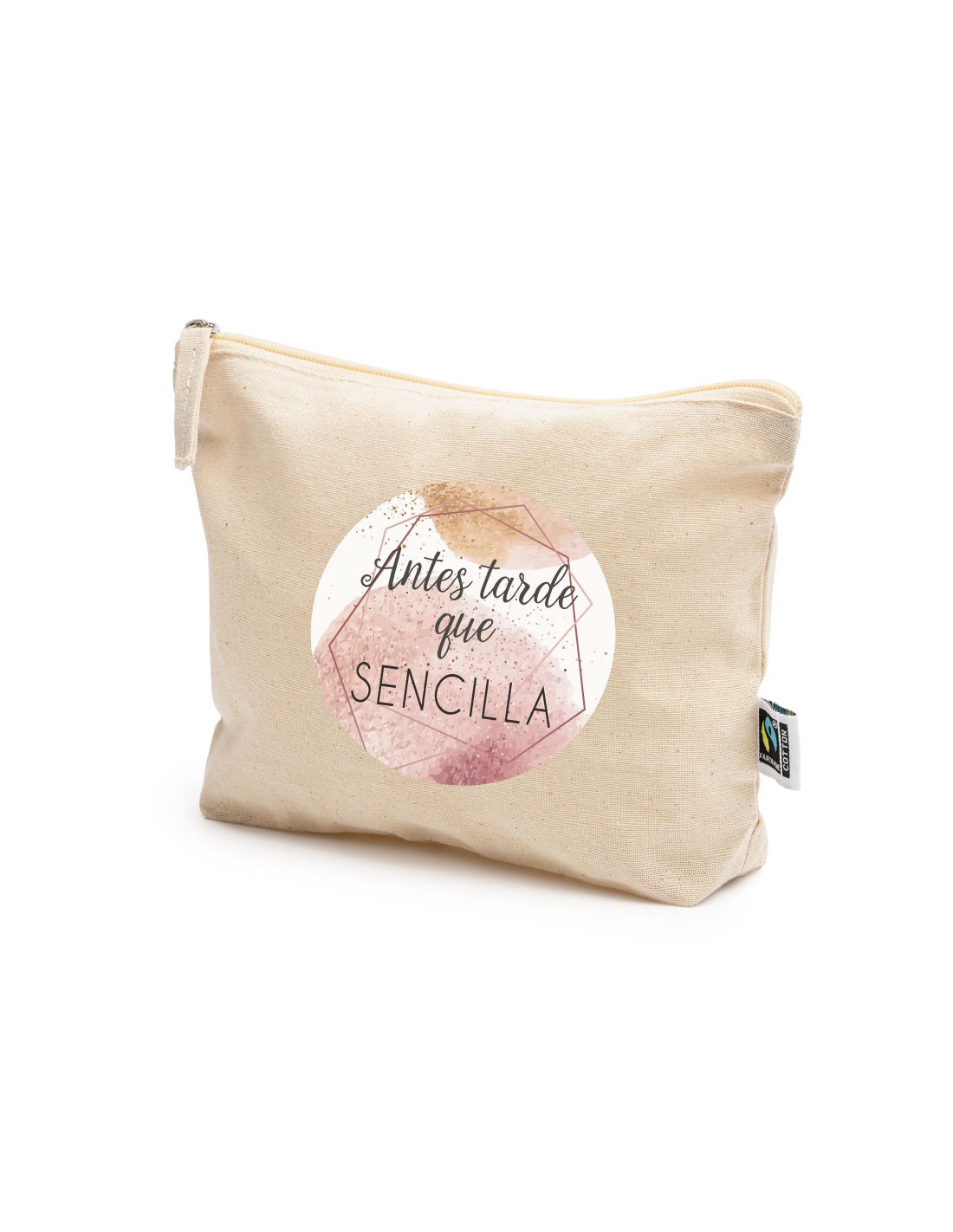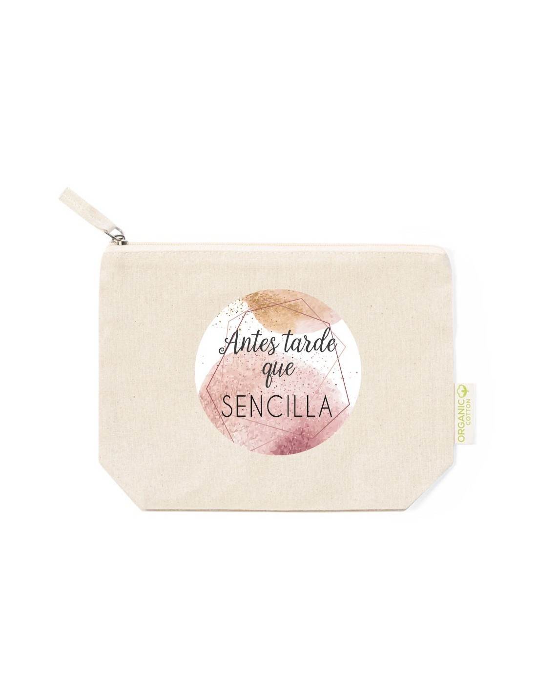 Práctico y ligero neceser de algodón con cierre de cremallera decorado con el mensaje "antes tarde que sencilla".