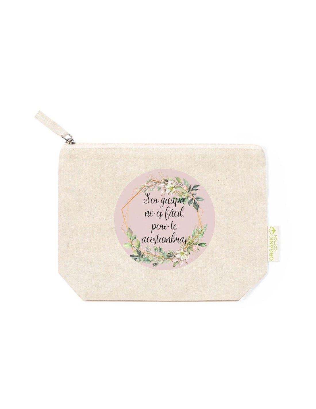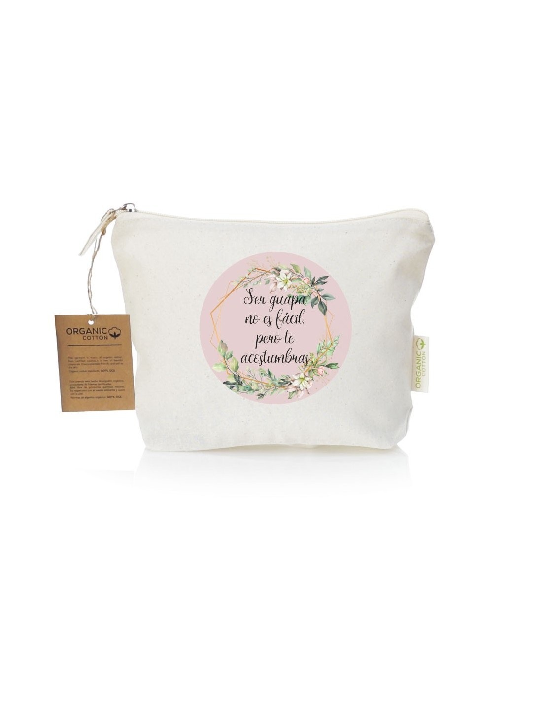 Práctico y ligero neceser de algodón con cierre de cremallera decorado con el mensaje "ser guapa no es fácil pero te acostumbras".