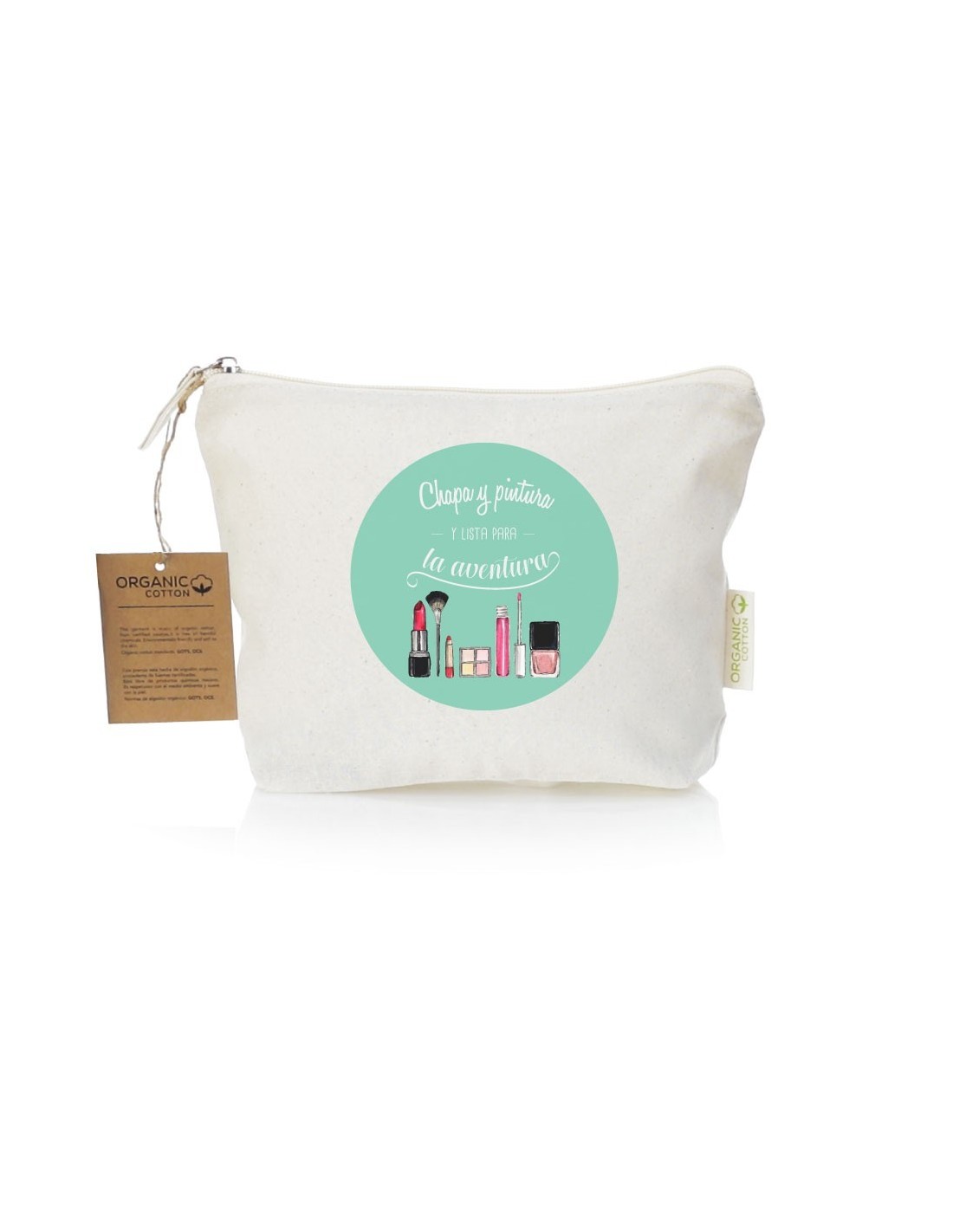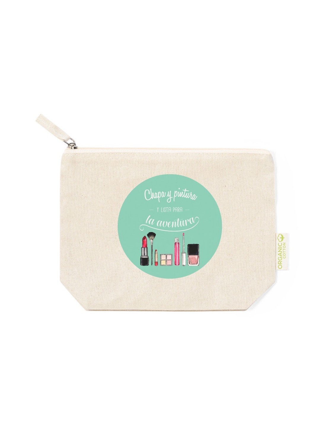 Práctico y ligero neceser de algodón con cierre de cremallera decorado con el mensaje "chapa y pintura y lista para la aventura".
