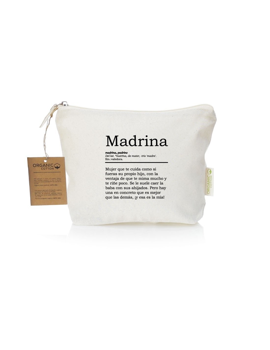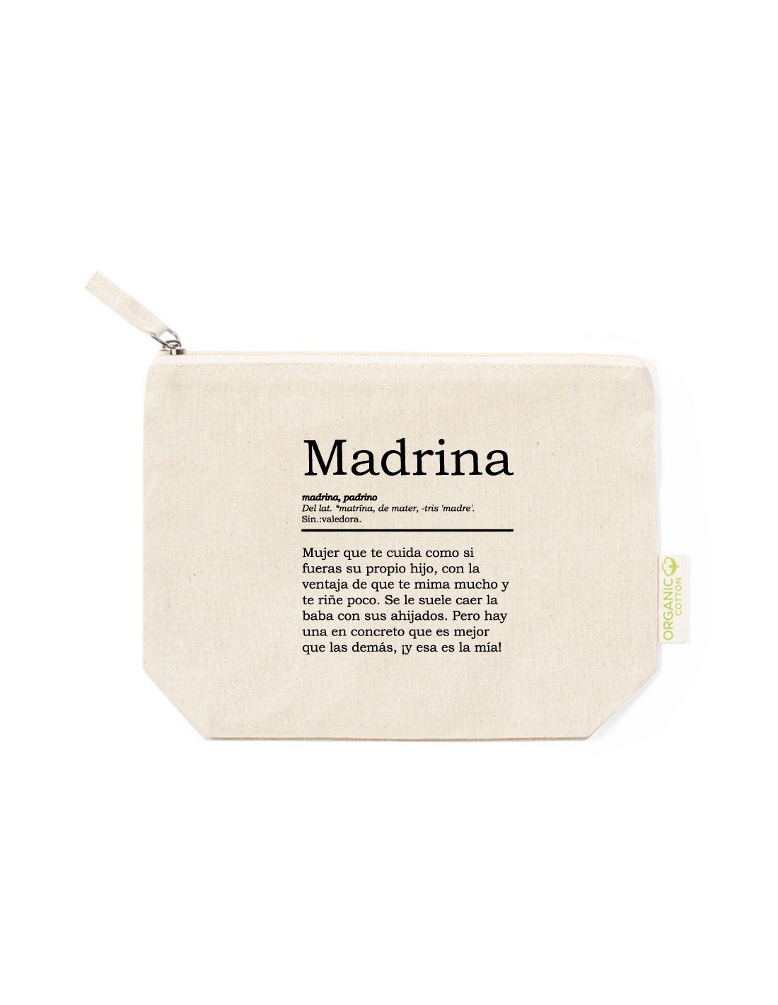 Práctico y ligero neceser de algodón con cierre de cremallera decorado con una divertida definición de madrina.