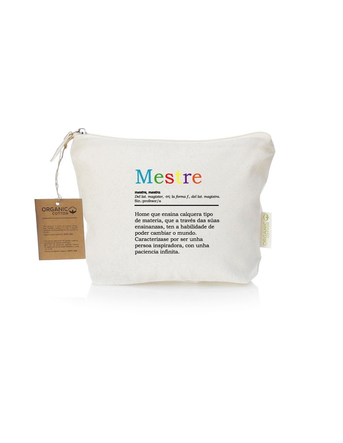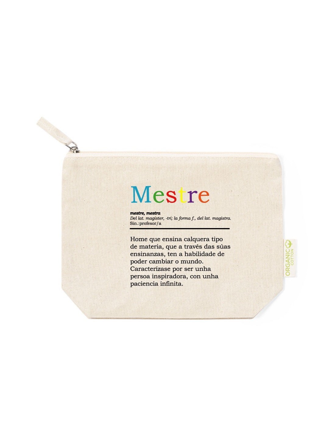 Práctico y ligero neceser de algodón con cierre de cremallera decorado con una cariñosa definición de profesor en gallego.