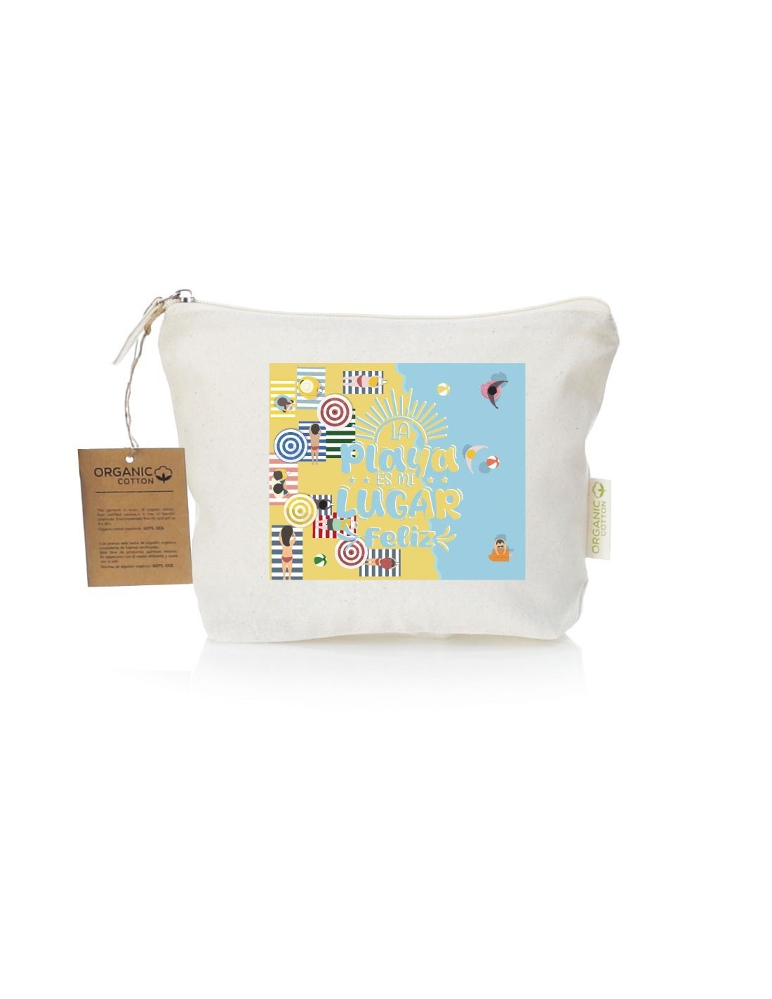 Práctico y ligero neceser de algodón con cierre de cremallera decorado con el mensaje "la playa es mi lugar feliz".