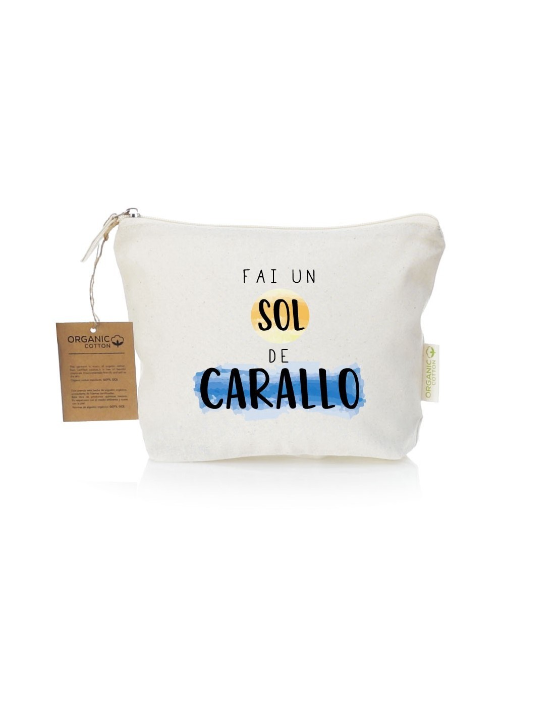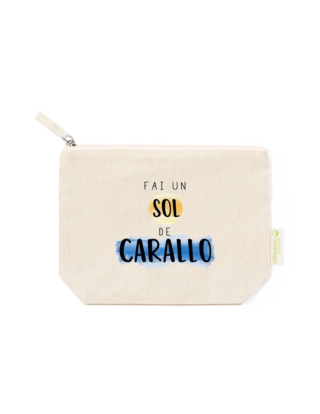 Práctico y ligero neceser de algodón con cierre de cremallera decorado con el mensaje "fai un sol de carallo".