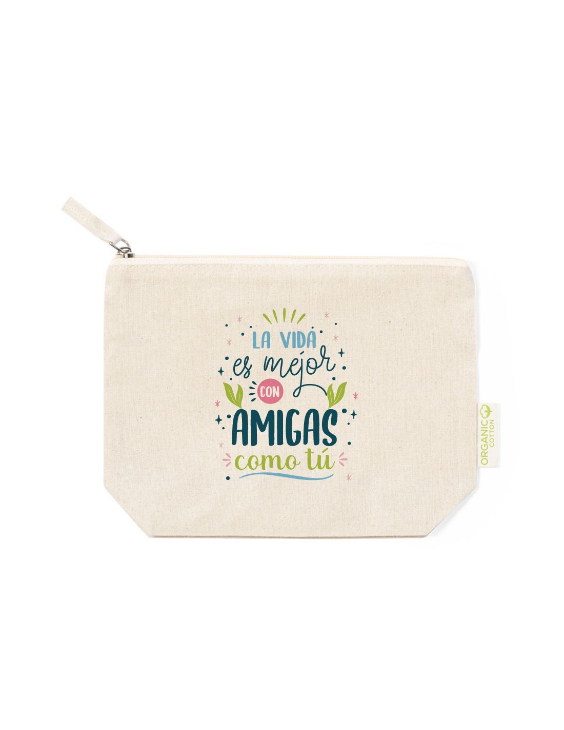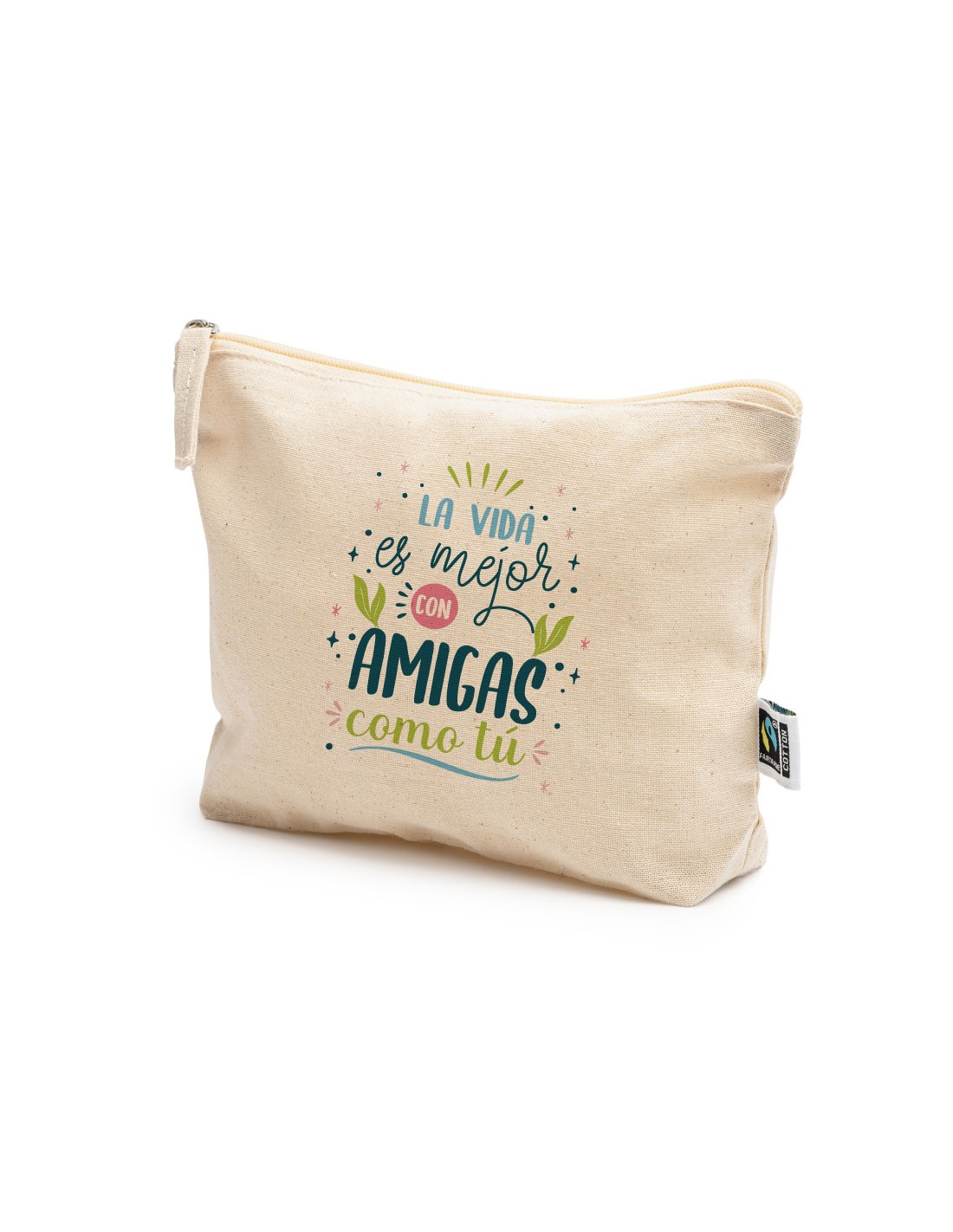 Práctico y ligero neceser de algodón con cierre de cremallera decorado con el mensaje "a vida es mejor con amigas como tú".