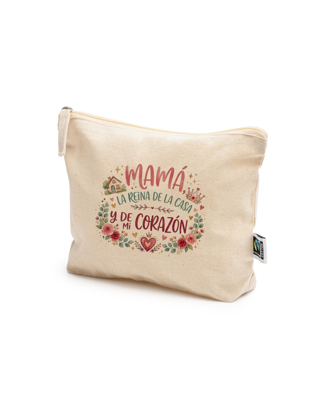 Práctico y ligero neceser de algodón con cierre de cremallera decorado con el mensaje "Mamá la reina de la casa y de mi corazón".