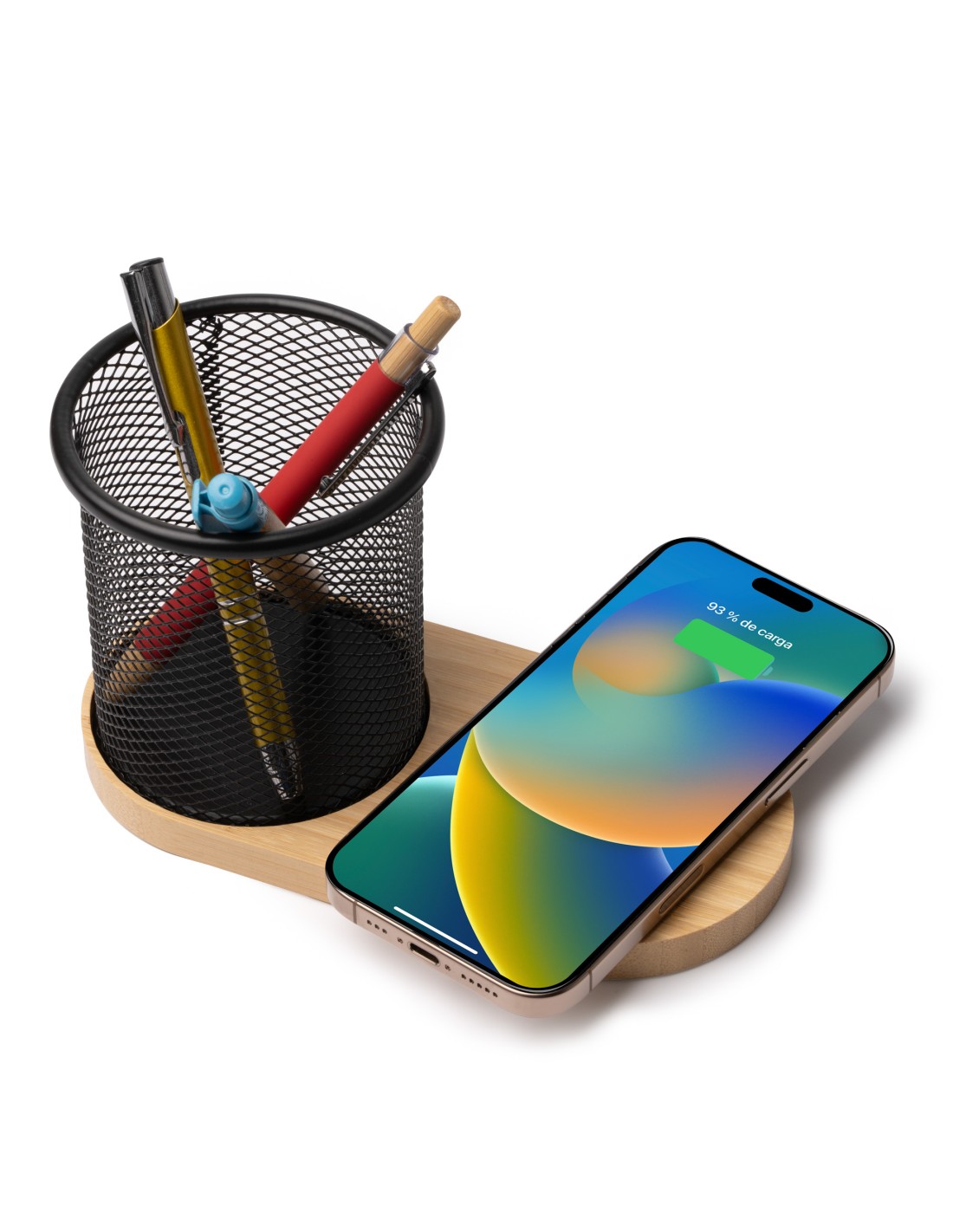 Con base elaborada en bambú con carga inalámbrica para dispositivos compatibles con este tipo de carga.