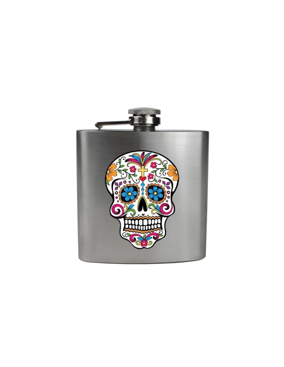 Original petaca de metal decorada con el dibujo de una calavera mexicana. Capacidad 6 oz.