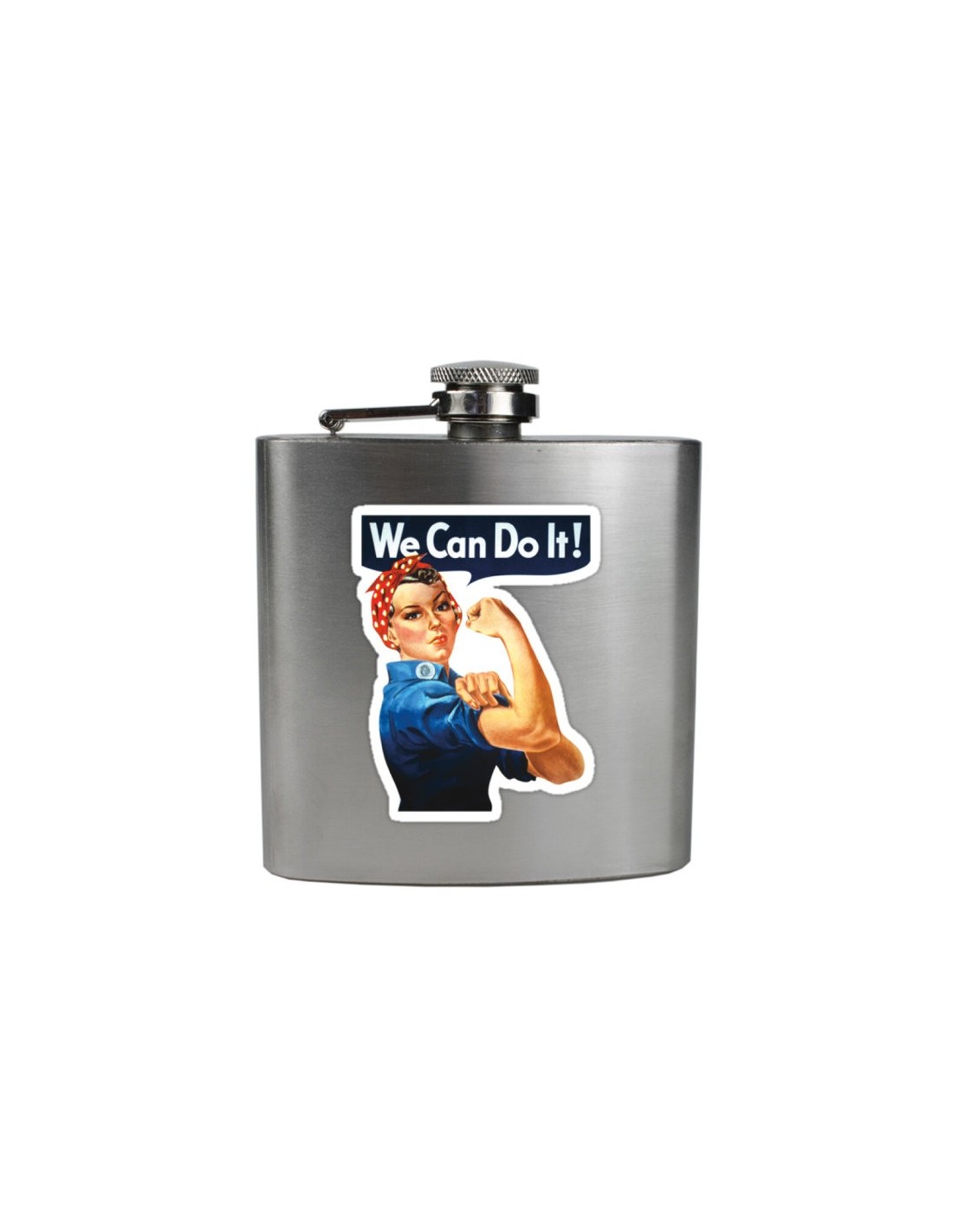 Original petaca de metal decorada con el mensaje "We can do it". Capacidad 6 oz.
