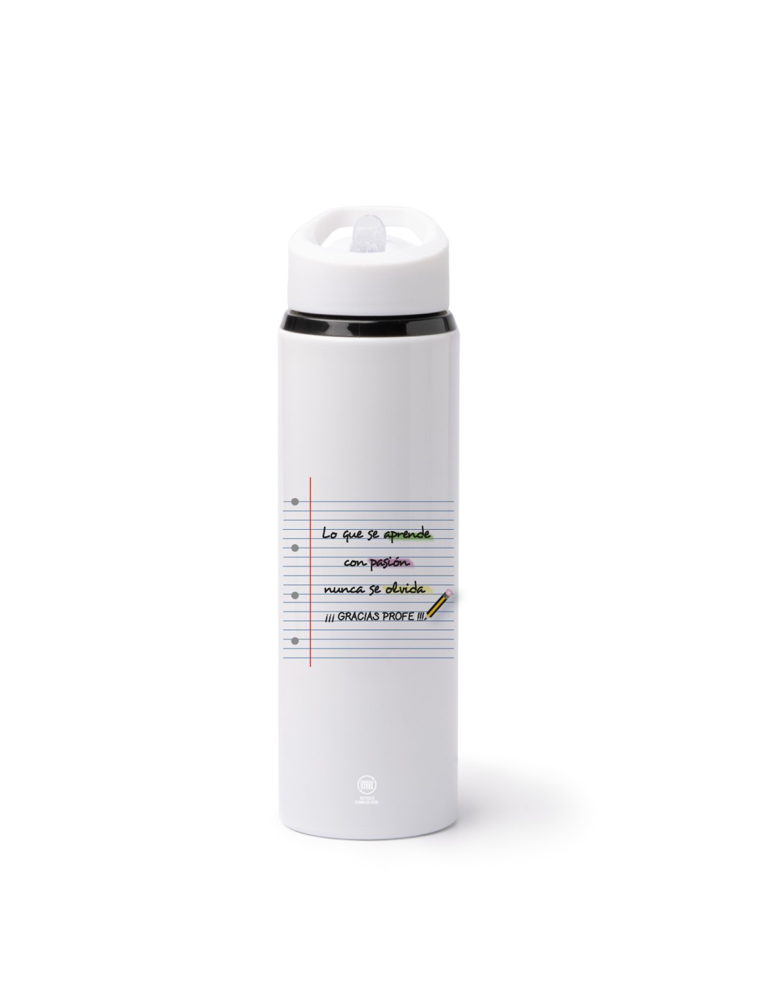 Original botella de acero inoxidable de 700 ml. decorada con el texto "lo que se aprende con pasión nunca se olvida, gracias profe".