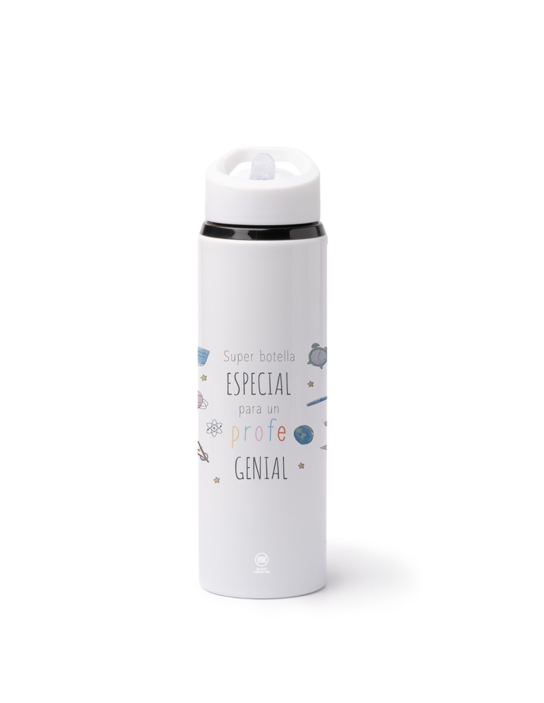 Original botella de acero inoxidable de 700 ml. decorada con el texto "super botella especial para un/a profe genial".