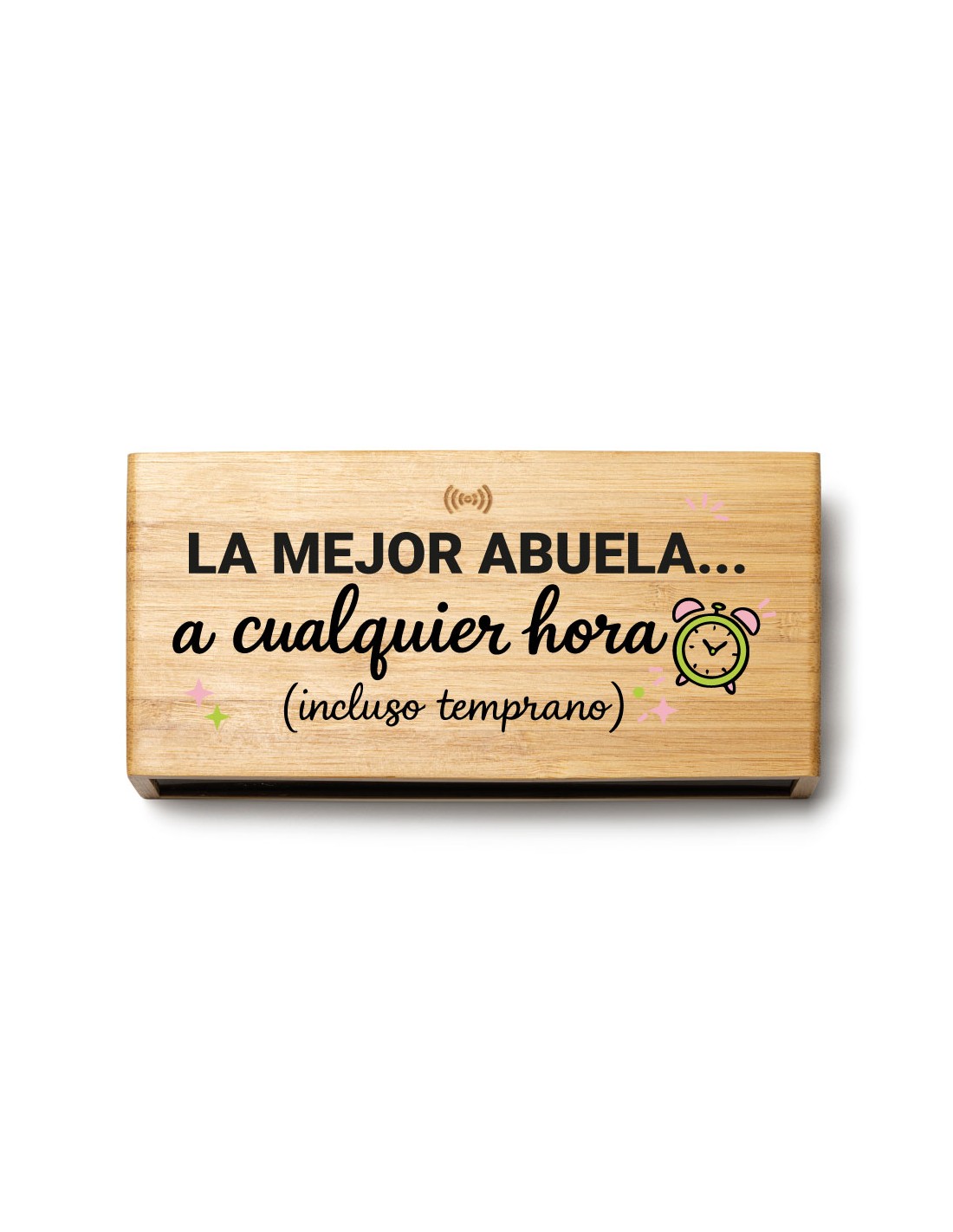 Original reloj despertador con superficie de carga inalámbrica decorado con el mensaje: "la mejor abuela a cualquier hora (incluso temprano)".