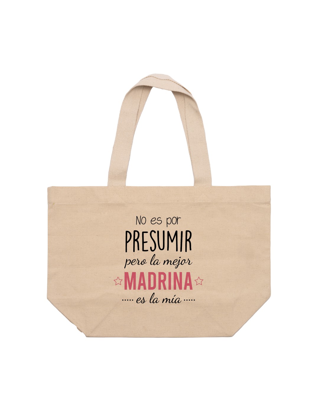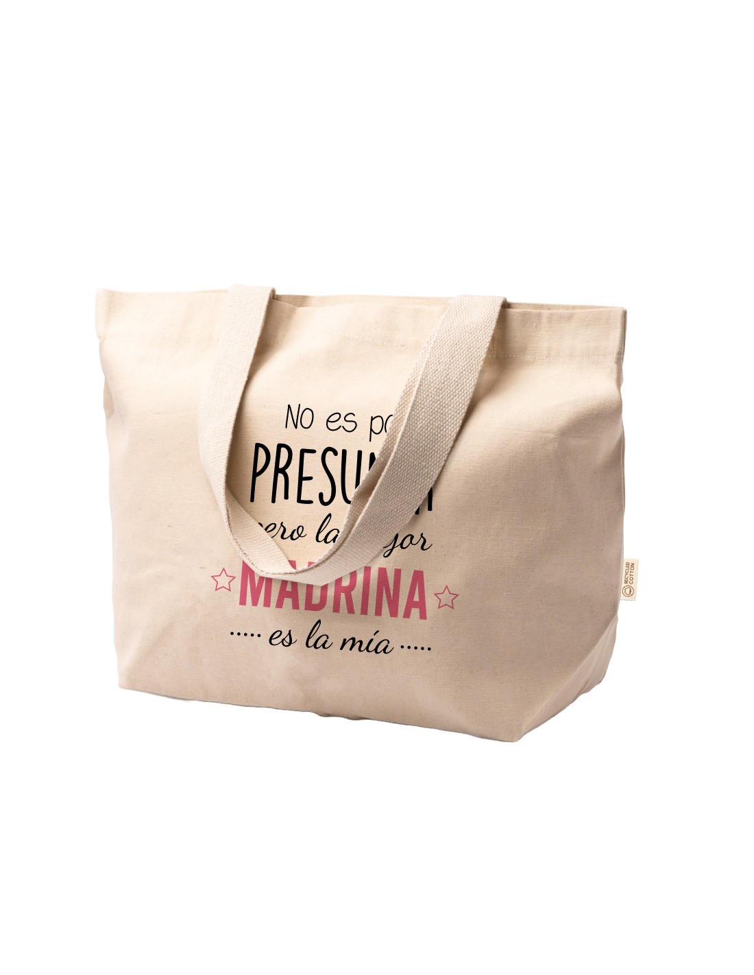 Amplio y ligero capazo de algodón decorado con el mensaje "no es por presumir pero la mejor madrina es la mía".
