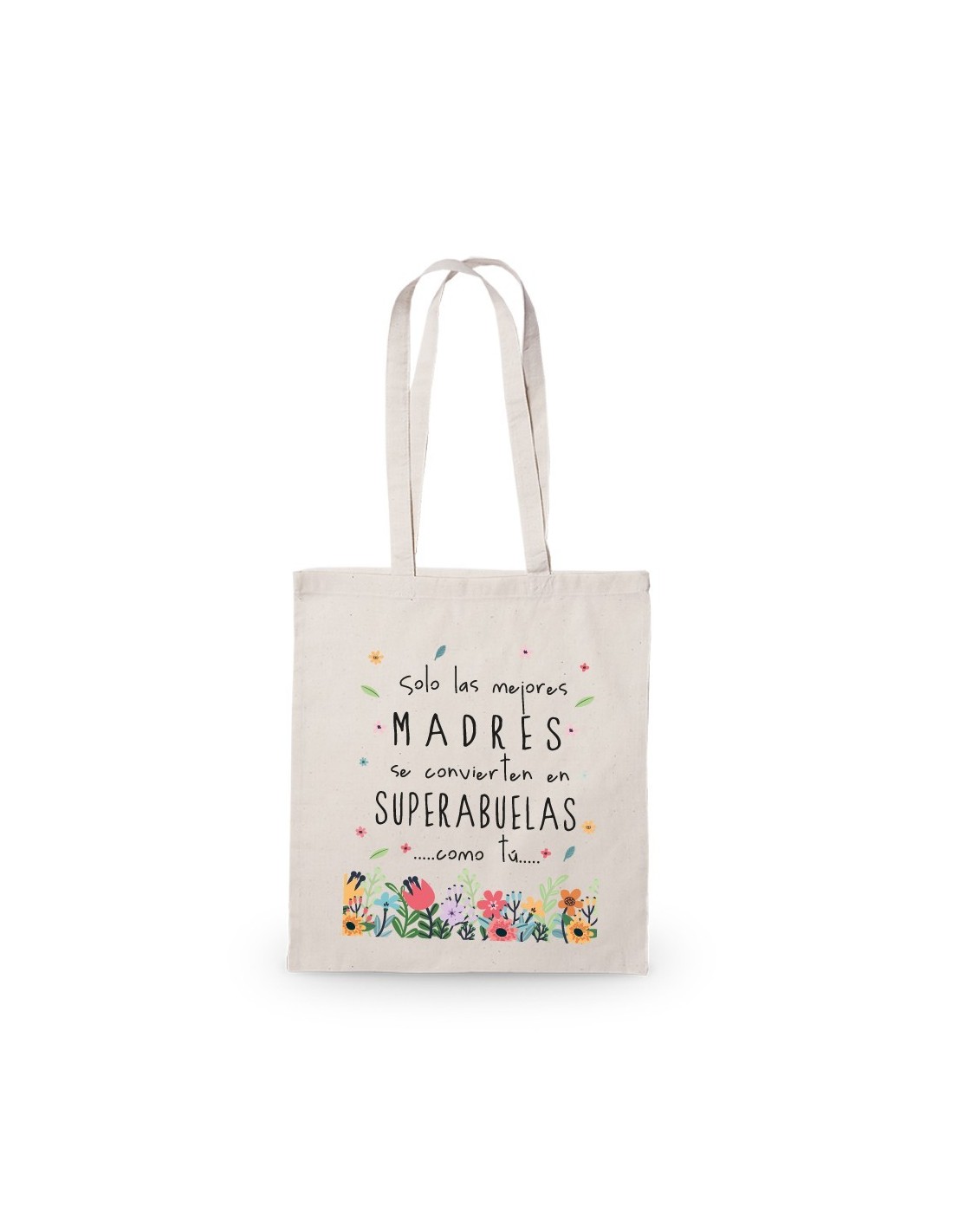 Amplia y ligera bolsa de algodón decorada con el mensaje "solo las mejores madres se convierten en superabuelas como tú".