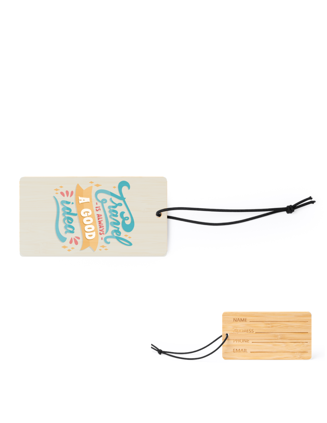 Identificador de maletas de bambú con banda elástica en color negro.