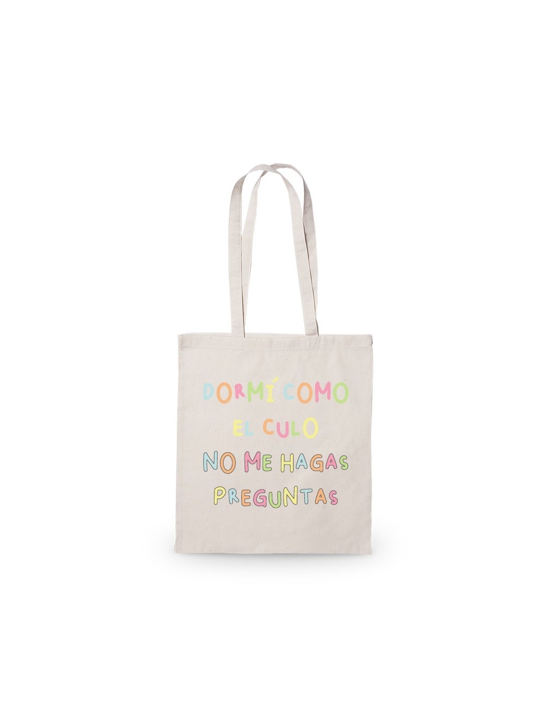 Amplia y ligera bolsa de algodón decorada con el mensaje "Dormí como el culo, no me hagas preguntas".