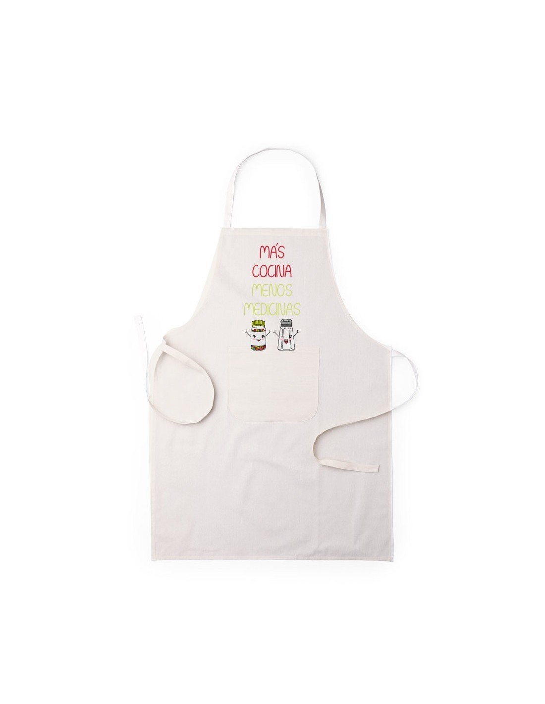 Original y divertido delantal decorado con el mensaje "más cocina menos medicinas".