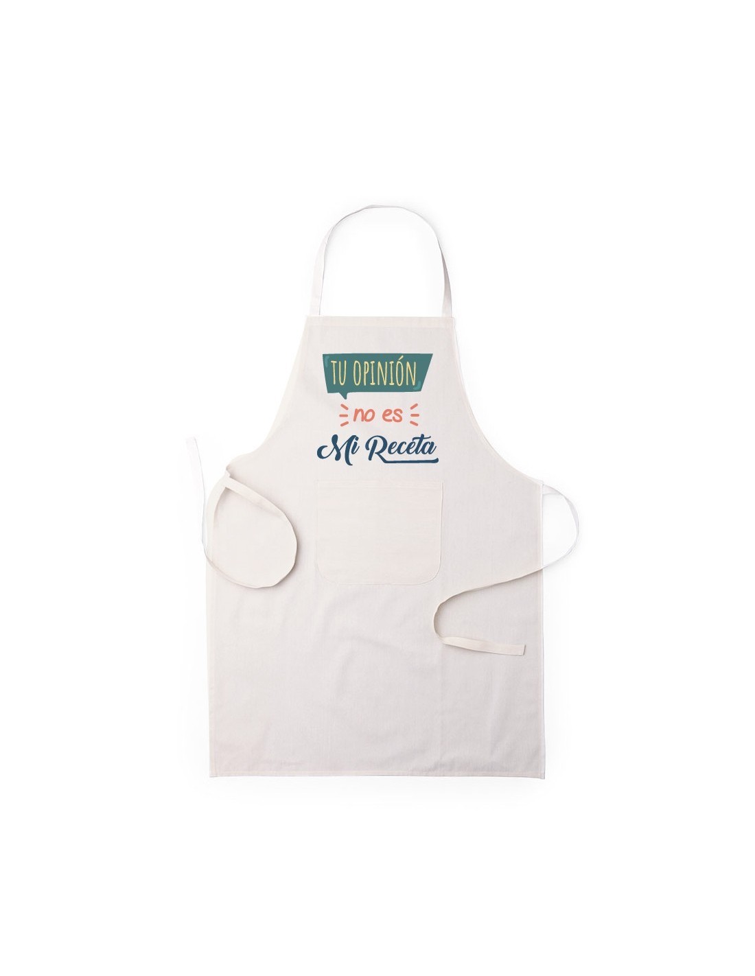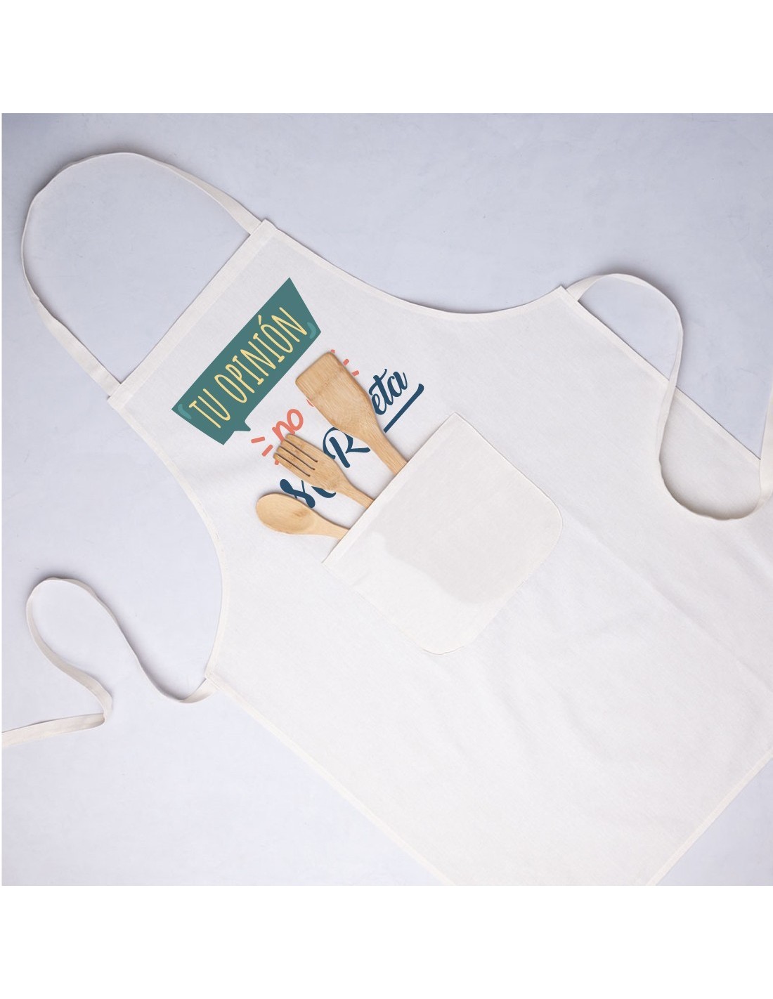 Original y divertido delantal decorado con el mensaje "tu opinión no es mi receta".