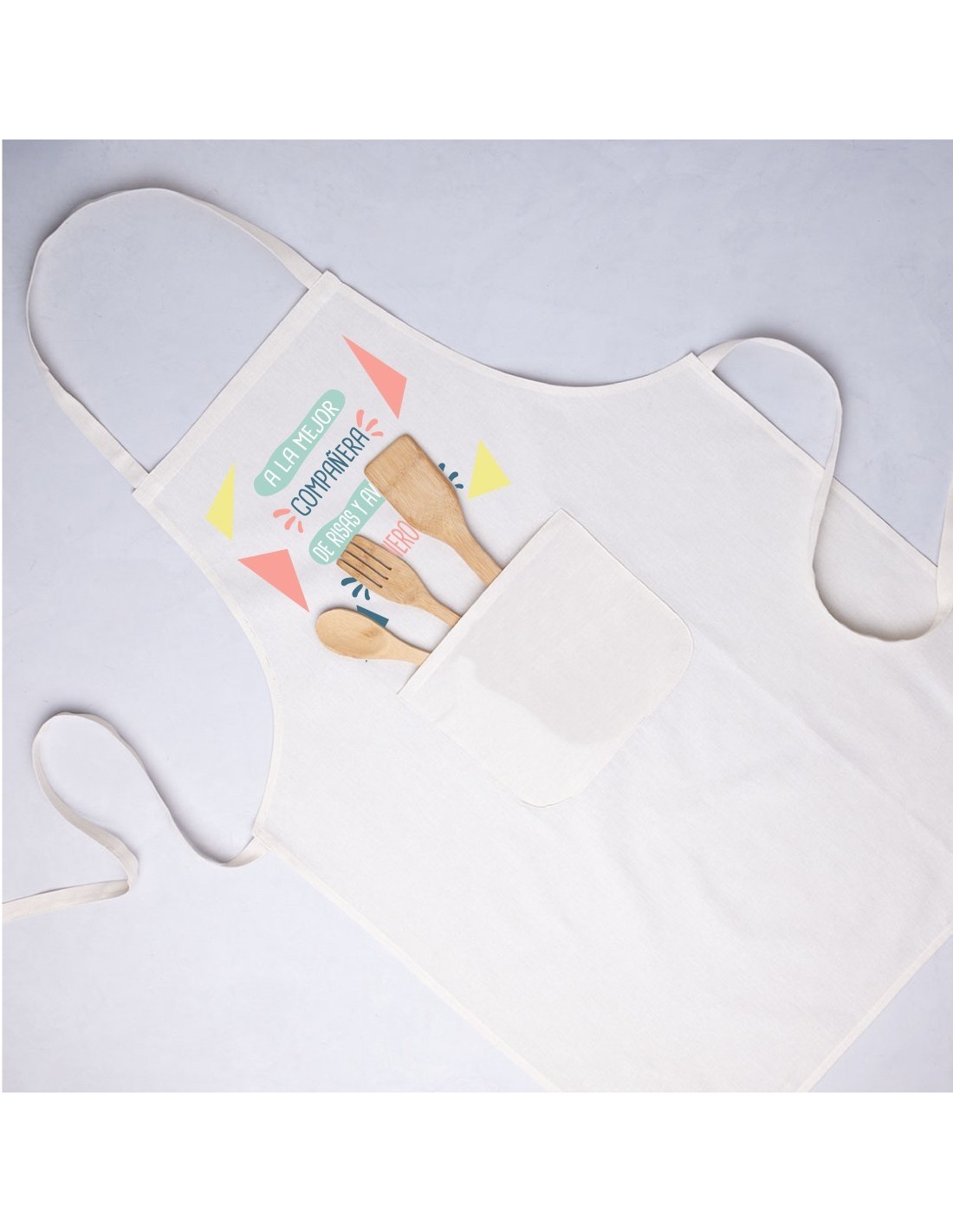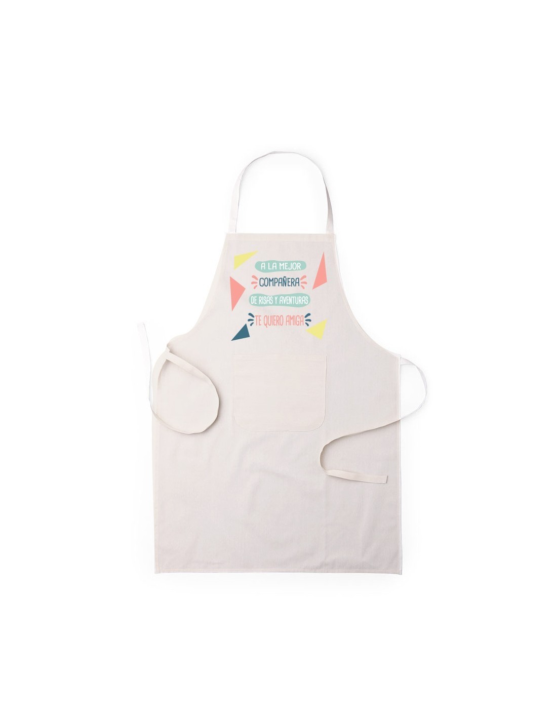 Original y divertido delantal decorado con el mensaje "a la mejor compañera de risas y aventuras, te quiero amiga".