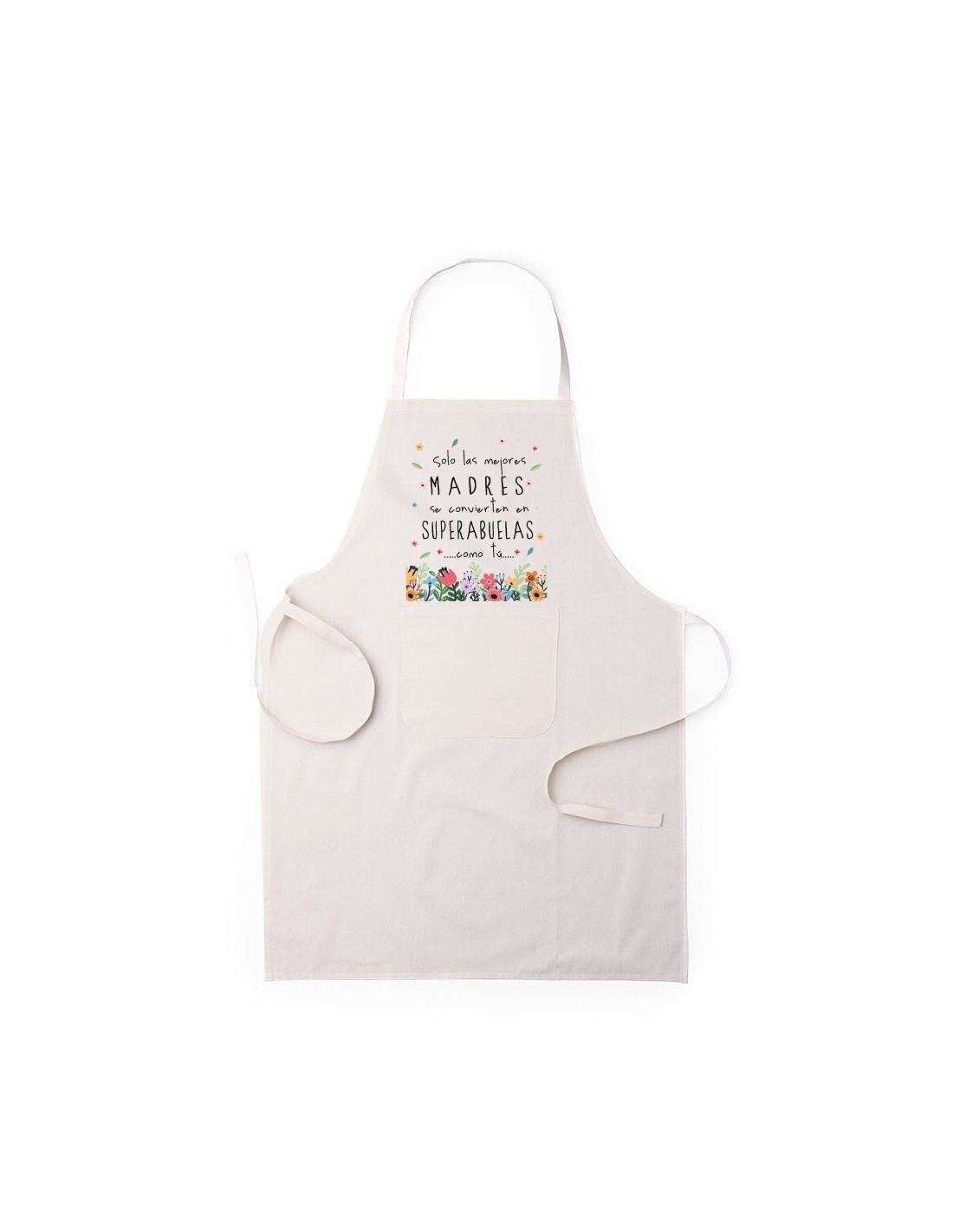 Original y divertido delantal decorado con el mensaje "solo las mejores abuelas se convierten en superabuelas como tú".