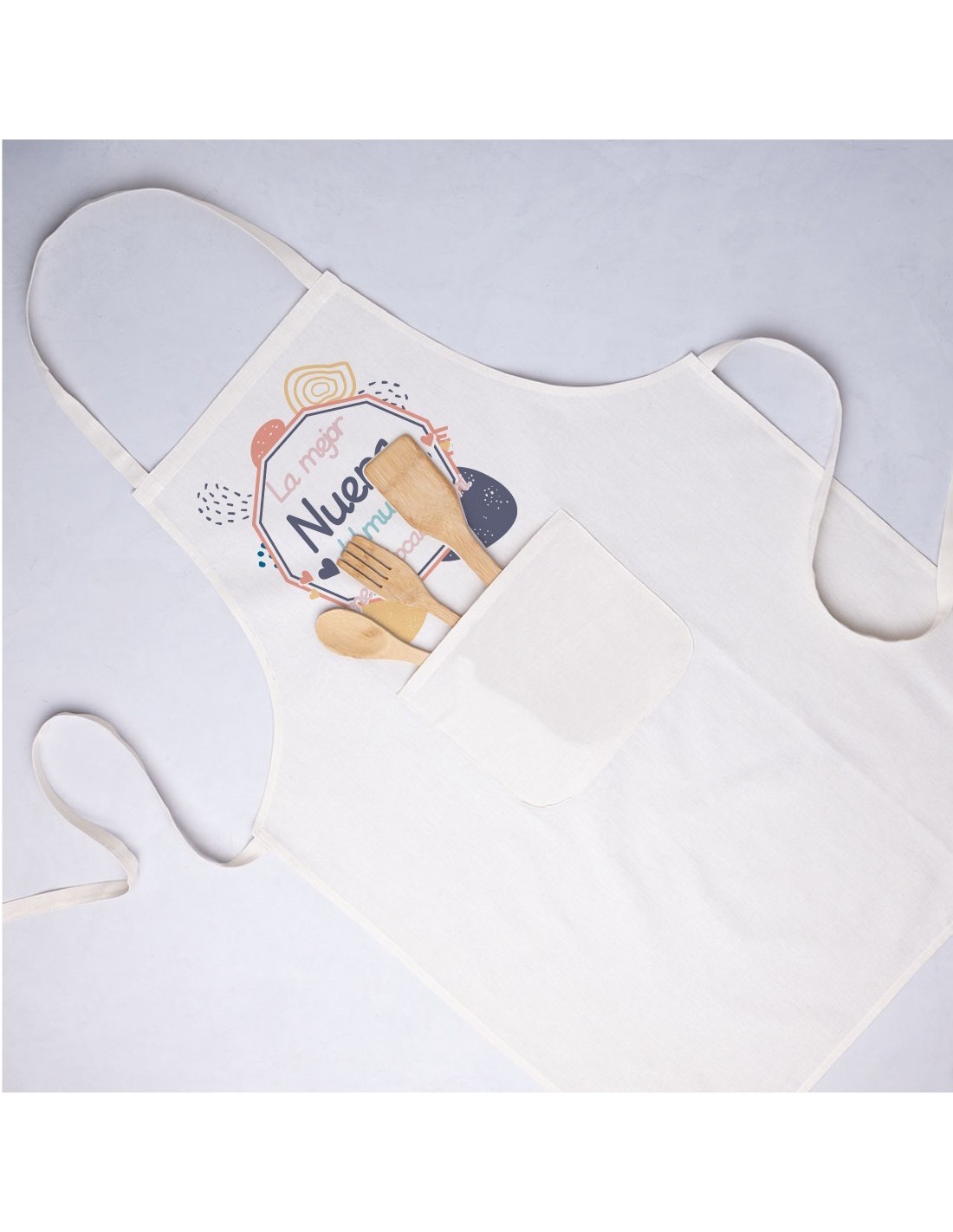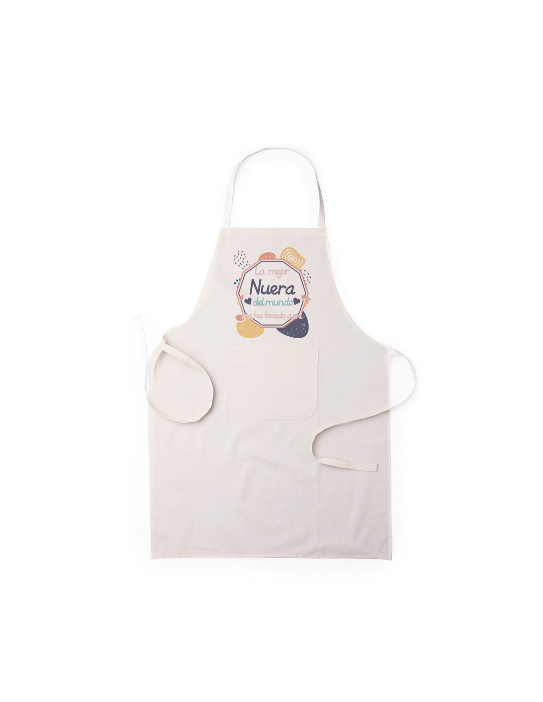 Original y divertido delantal decorado con el mensaje "la mejor nuera del mundo me ha tocado a mi".
