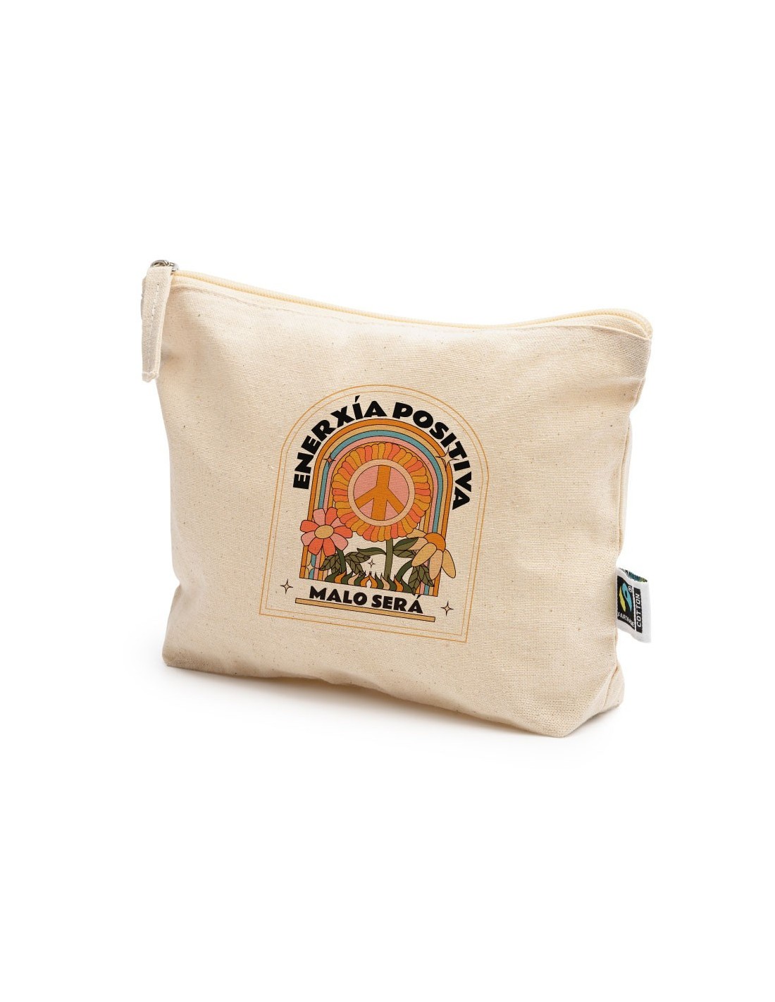 Práctico y ligero neceser de algodón con cierre de cremallera decorado con el mensaje "Enerxía positiva, malo será".